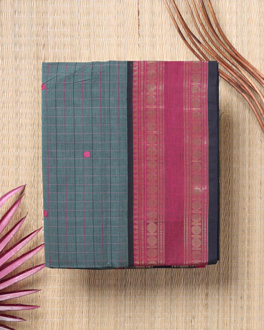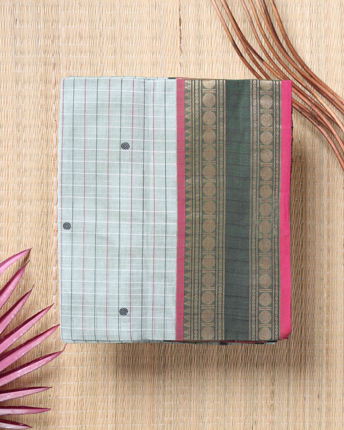 Handloom Cotton Saree with Checked Weave and Zari Border - Green