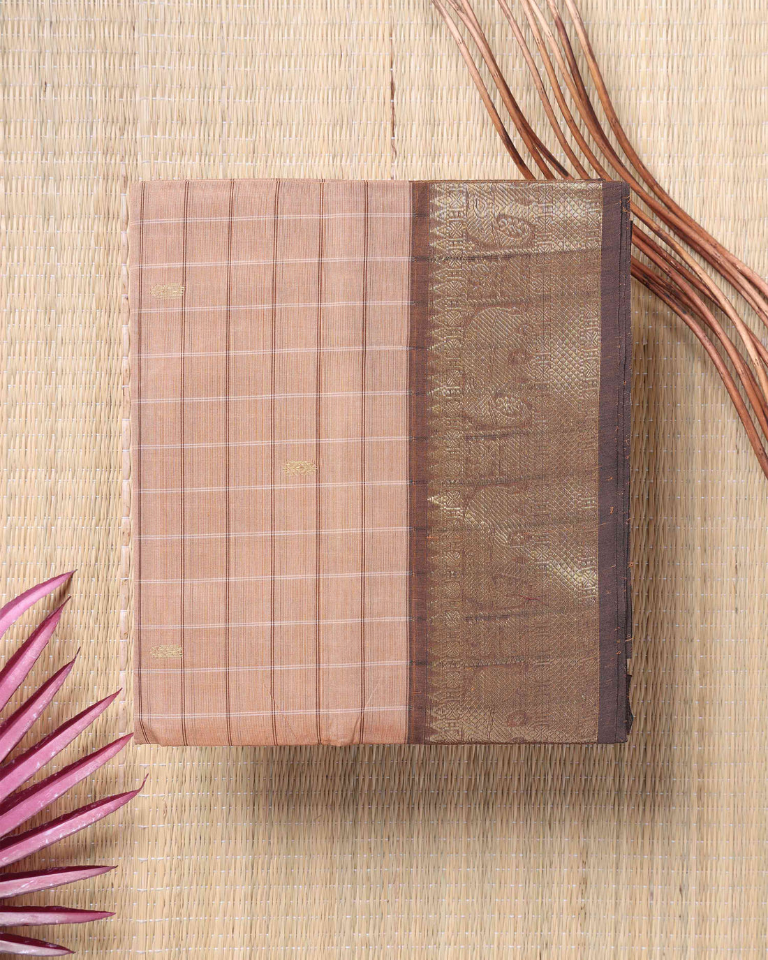 Handloom Cotton Saree with Checked Weave and Zari Border - Sandal