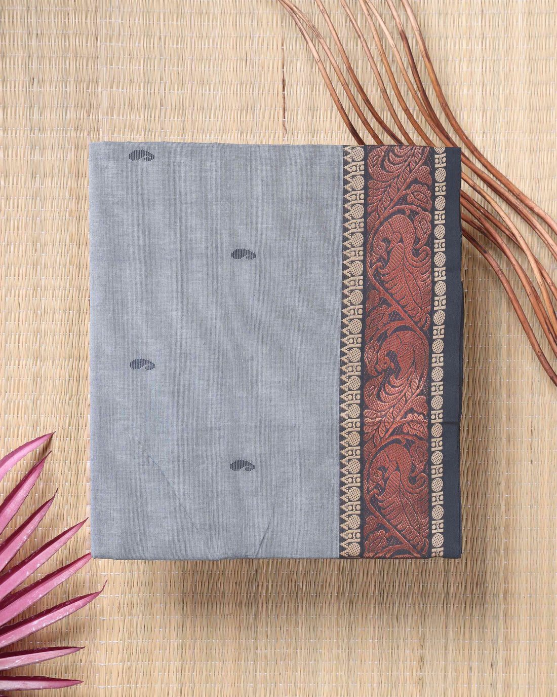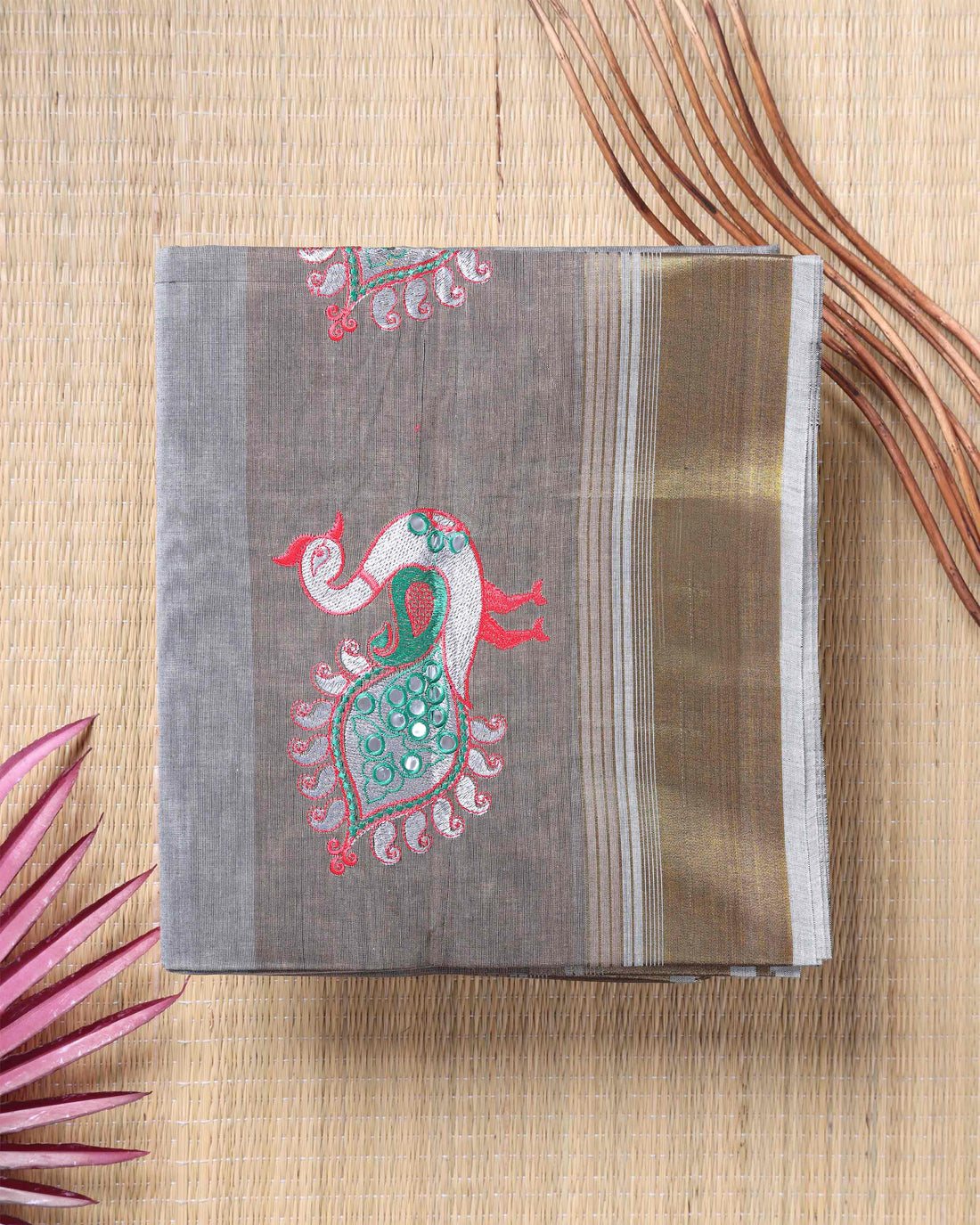 Handloom Cotton Saree with Peacock Embroidery - Grey