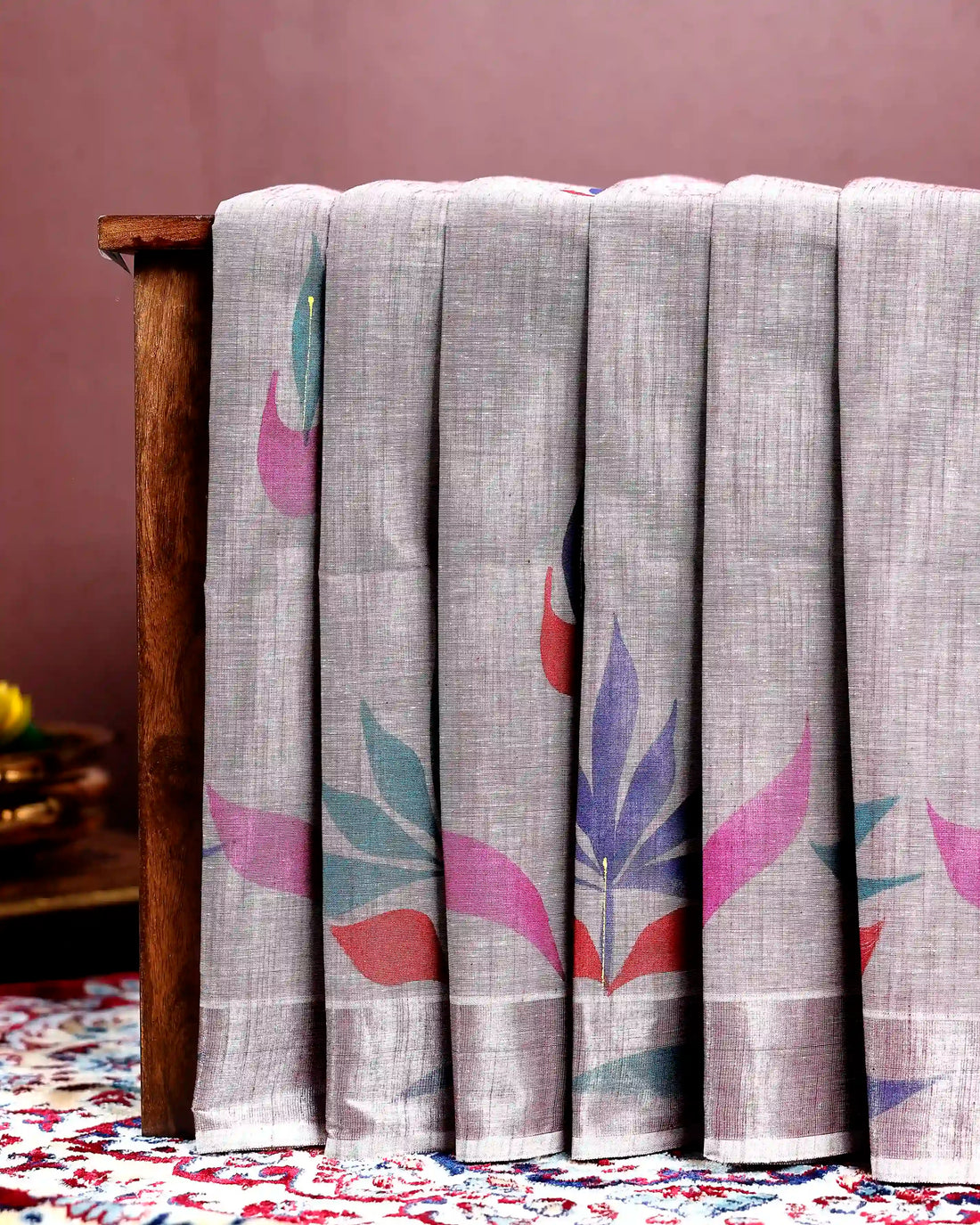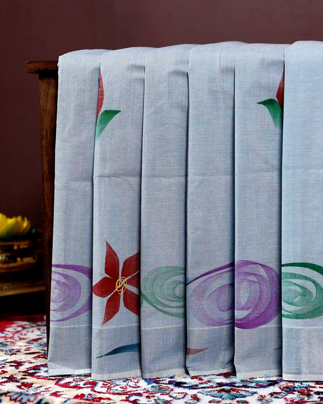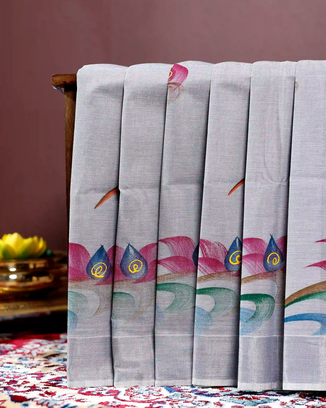 Handpainted Khadi Cotton Saree with Artistic Lotus Motif and Elegant Border Detailing - Grey