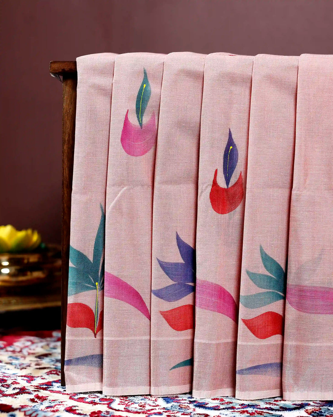 Handpainted Khadi Cotton Saree with Contemporary Floral Print and Minimalist Design - Pink