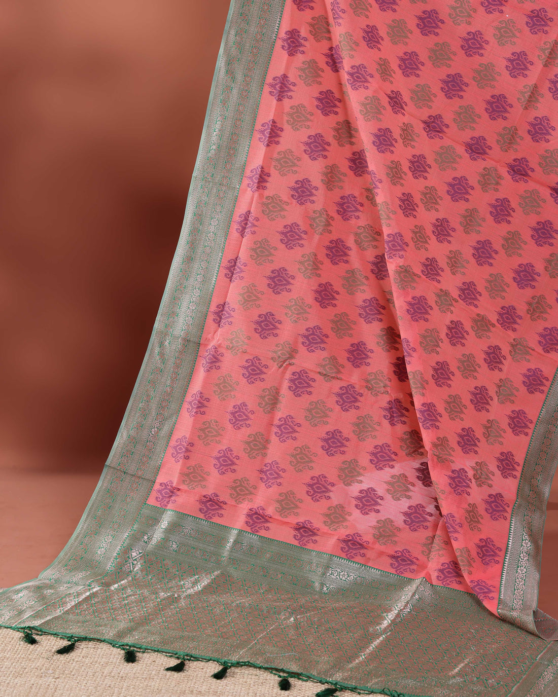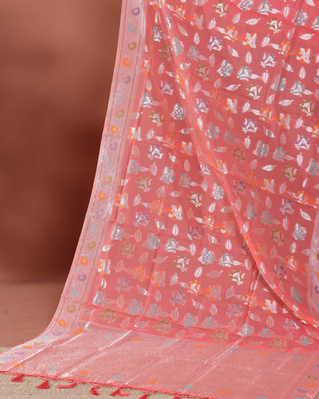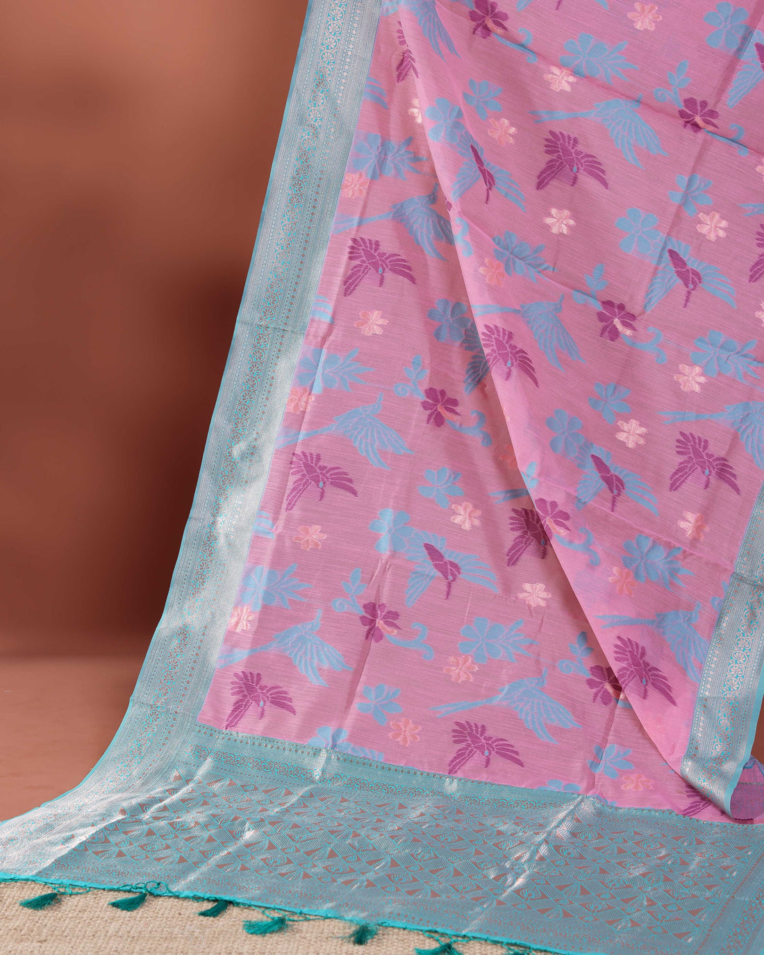 Floral Woven Rainbow Cotton Saree with Subtle Zari Accents - Pink