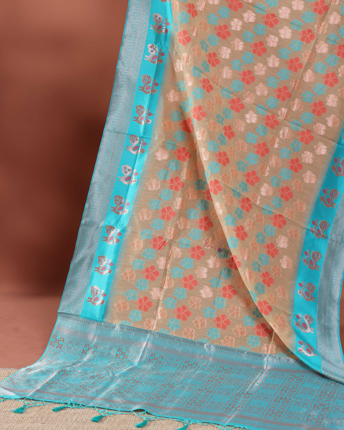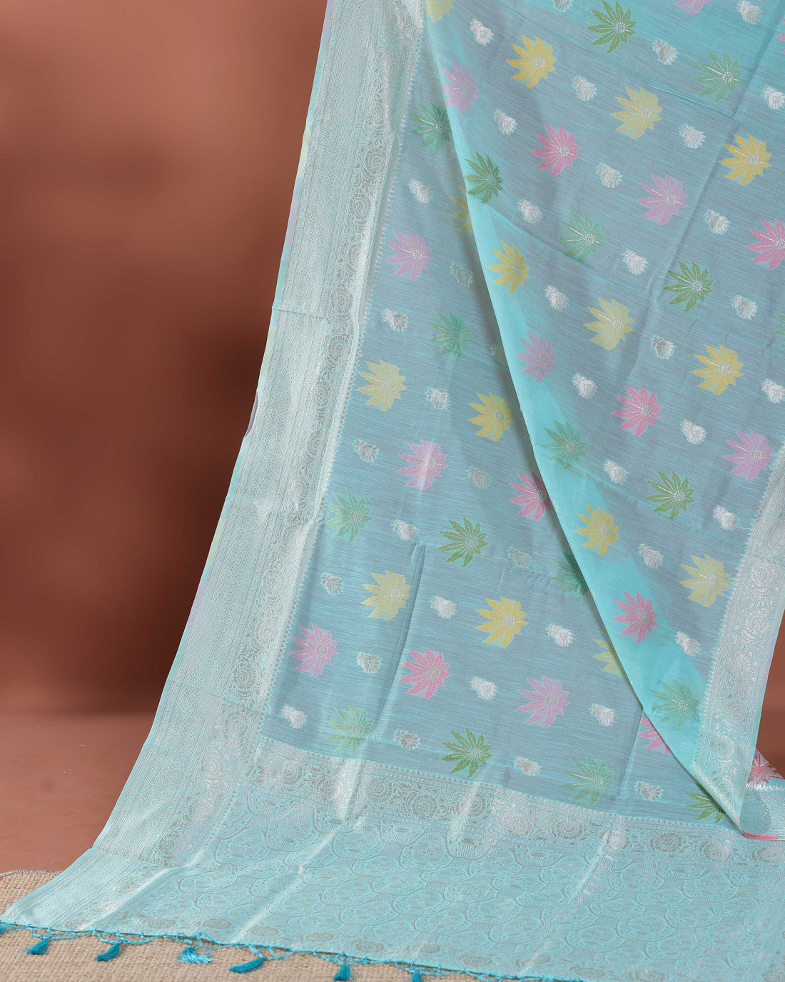 Floral Woven Rainbow Cotton Saree with Subtle Zari Accents - Blue
