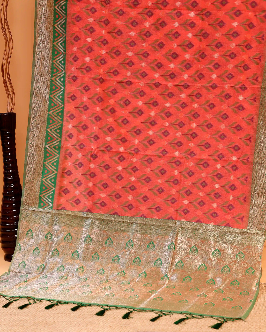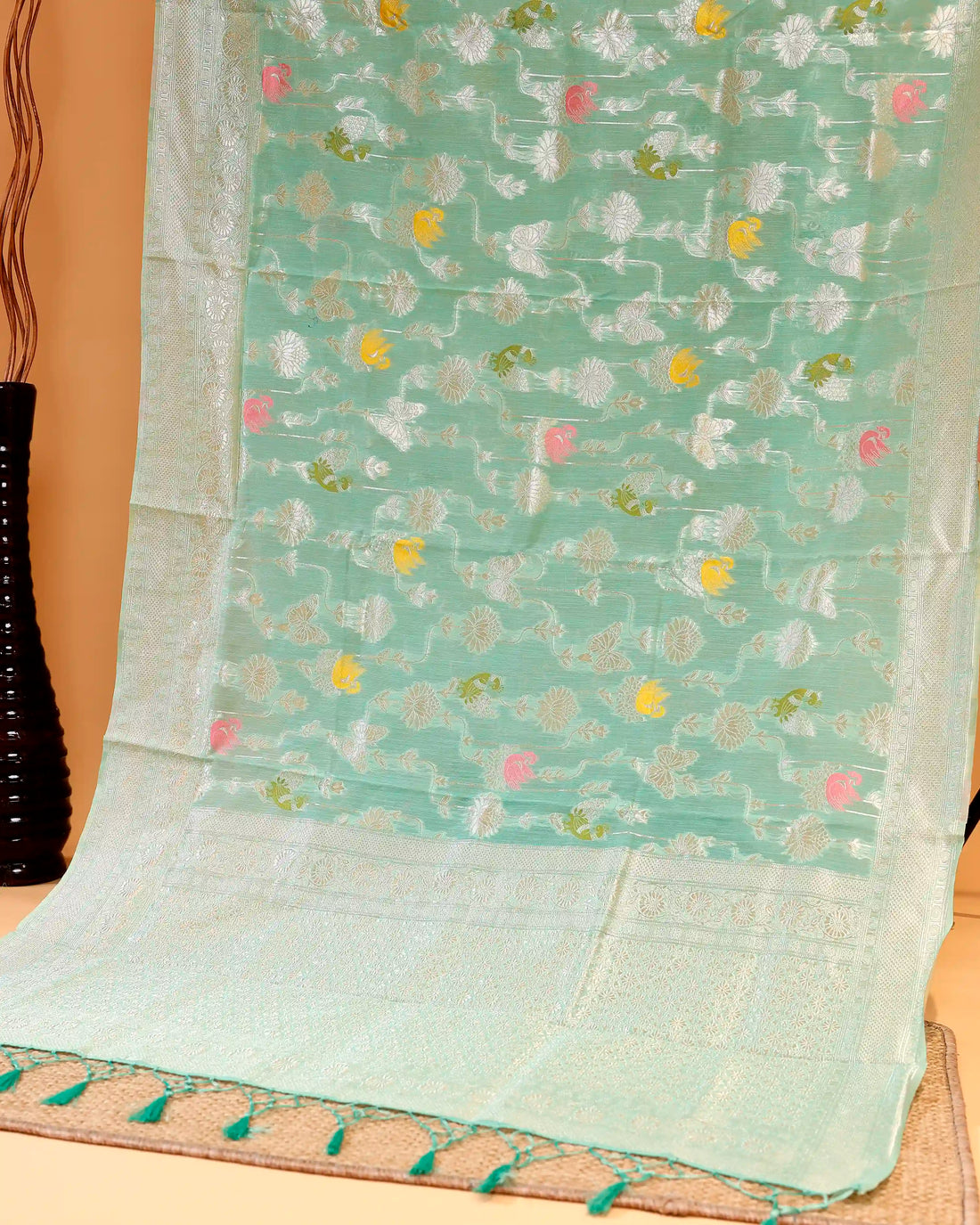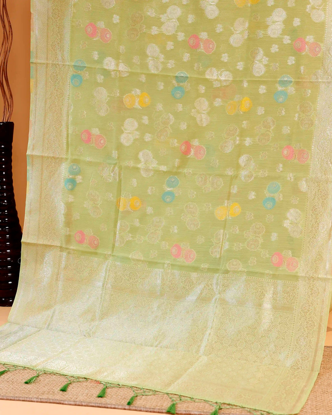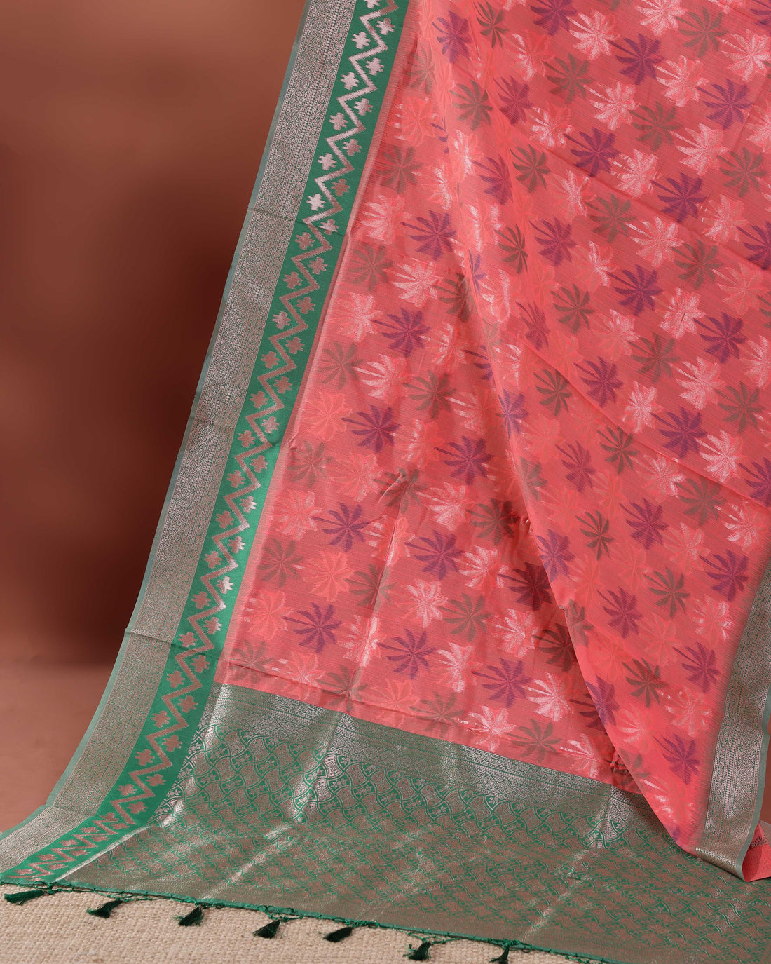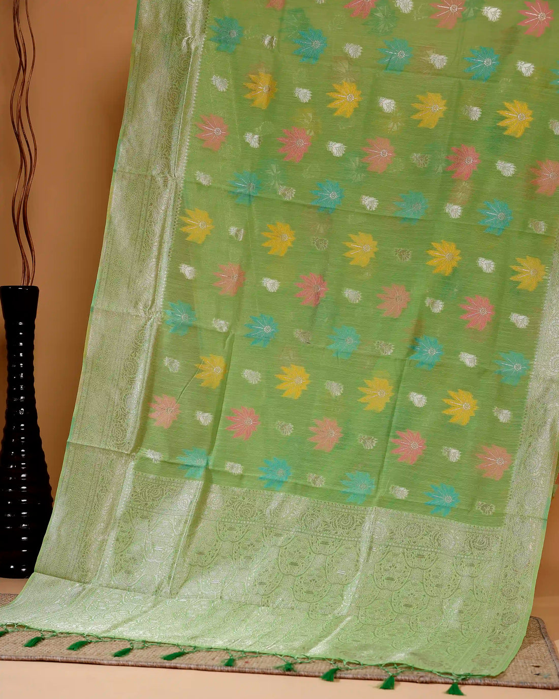 Floral Woven Rainbow Cotton Saree with Subtle Zari Accents - Green