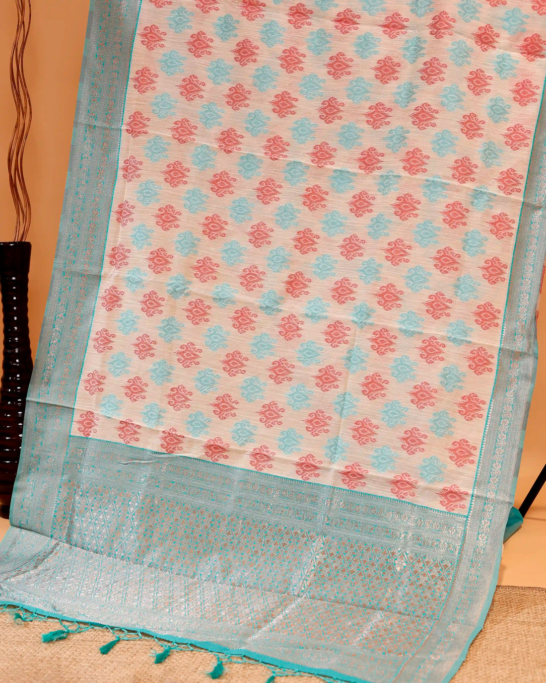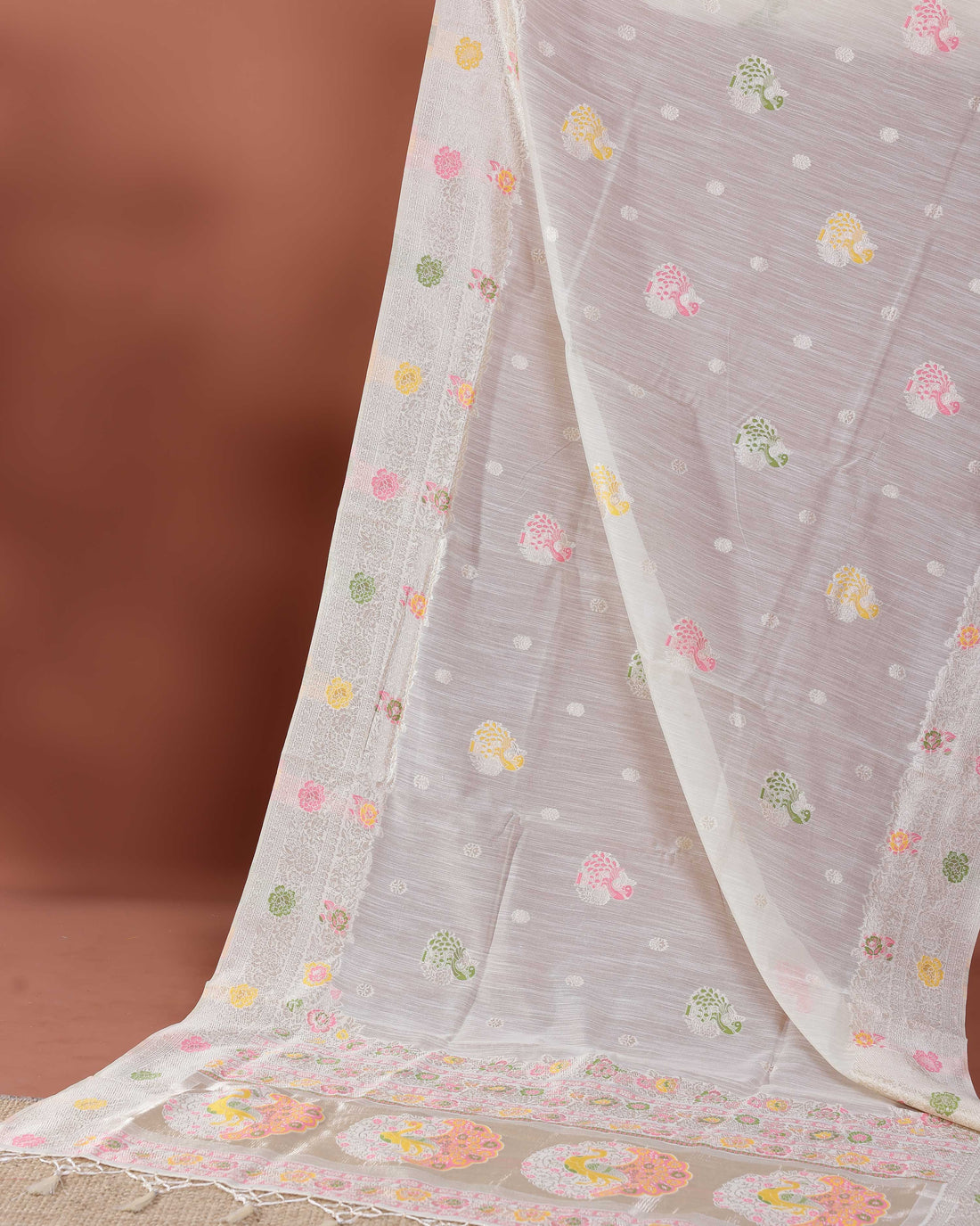 Floral Woven Rainbow Cotton Saree with Subtle Zari Accents - Cream
