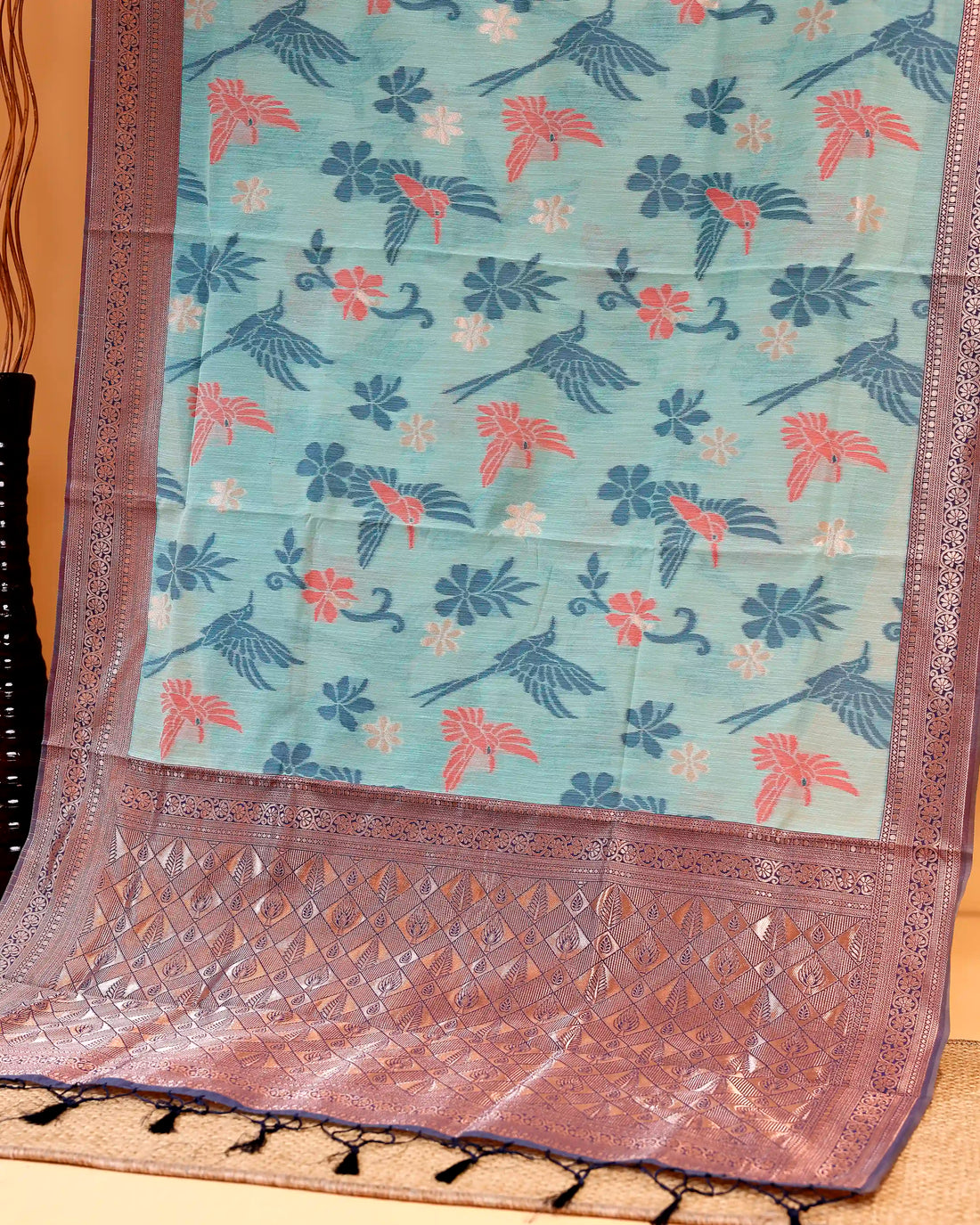 Handloom Rainbow Cotton Saree with Bird and Floral Motifs and Intricate Woven Border - Blue