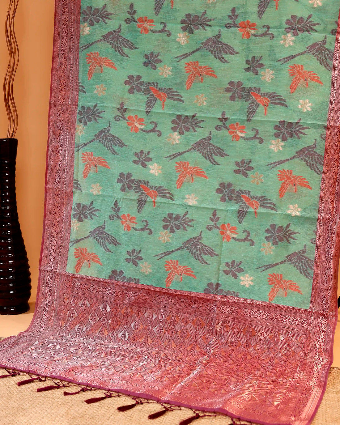 Handloom Rainbow Cotton Saree with Bird and Floral Motifs and Intricate Woven Border - Green