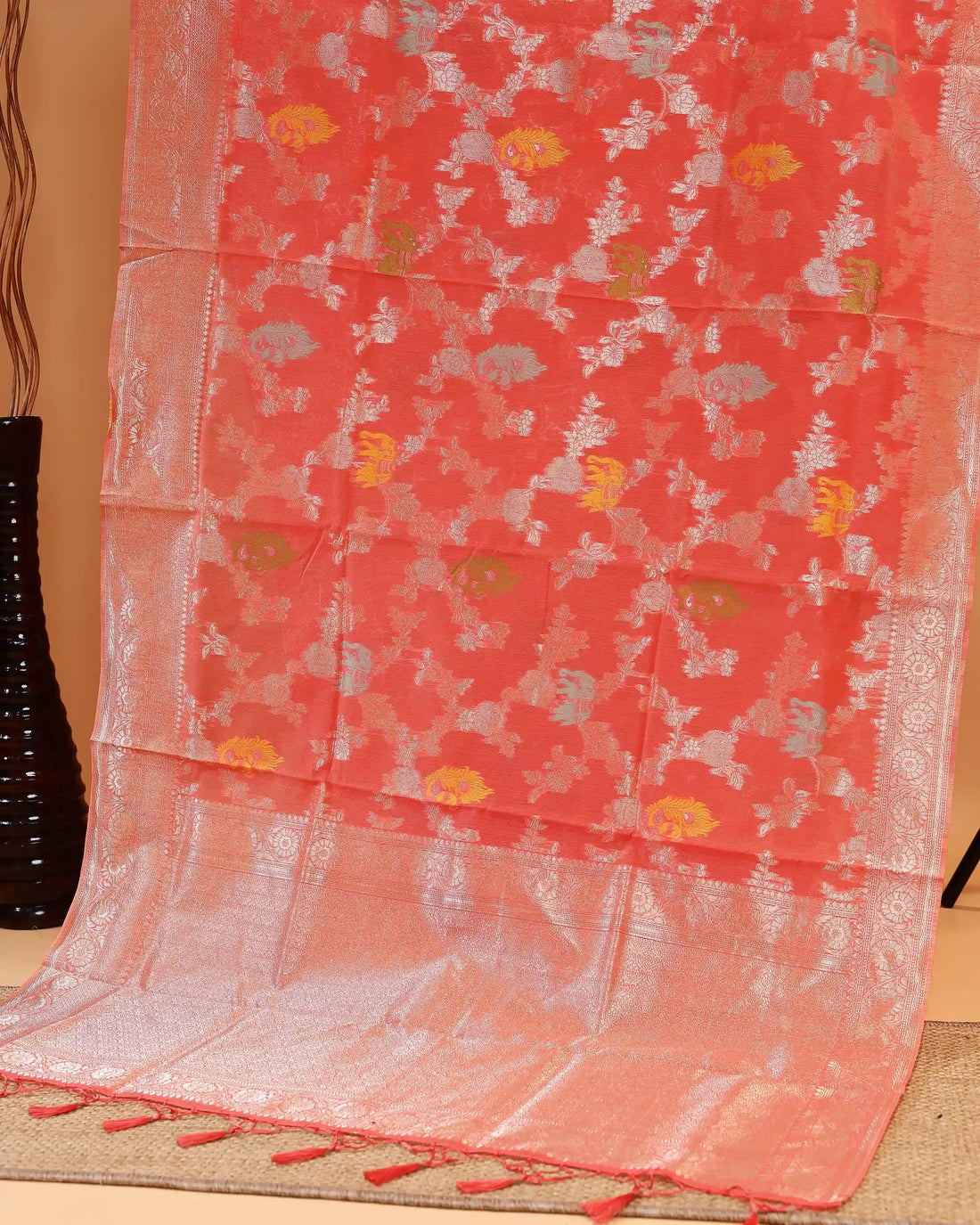 Floral Woven Rainbow Cotton Saree with Subtle Zari Accents - Peach