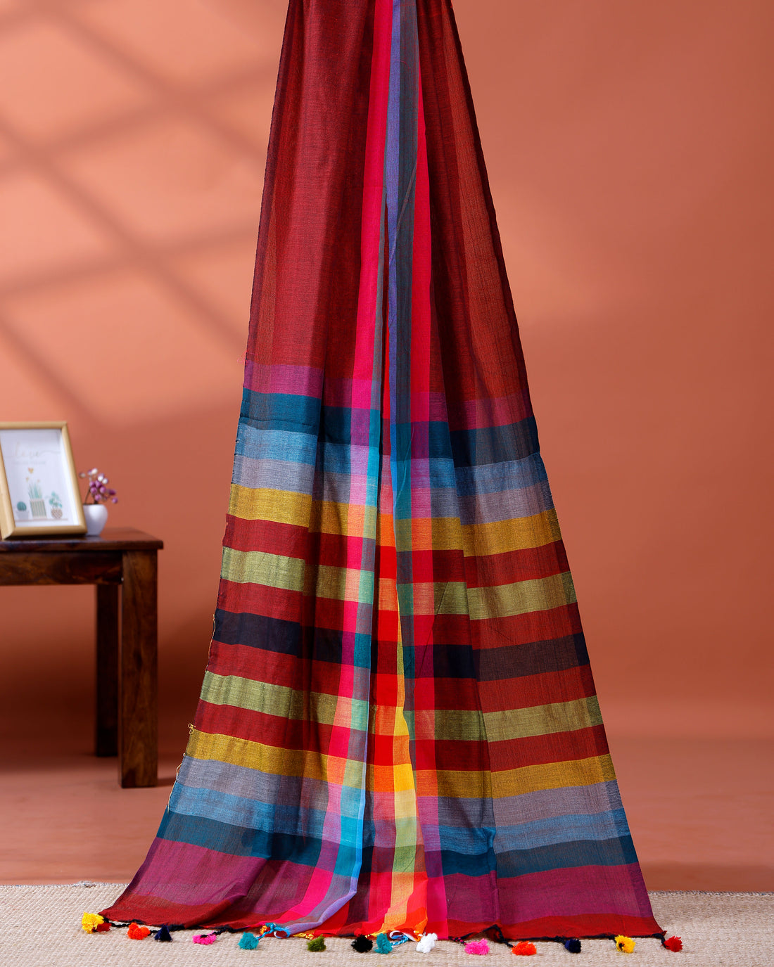 Elegant Rainbow Cotton Saree with Striped Pattern and Tassel Border - Maroon