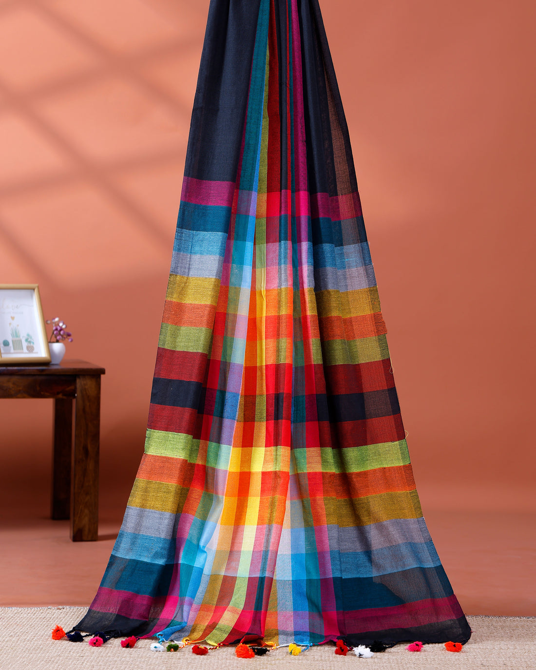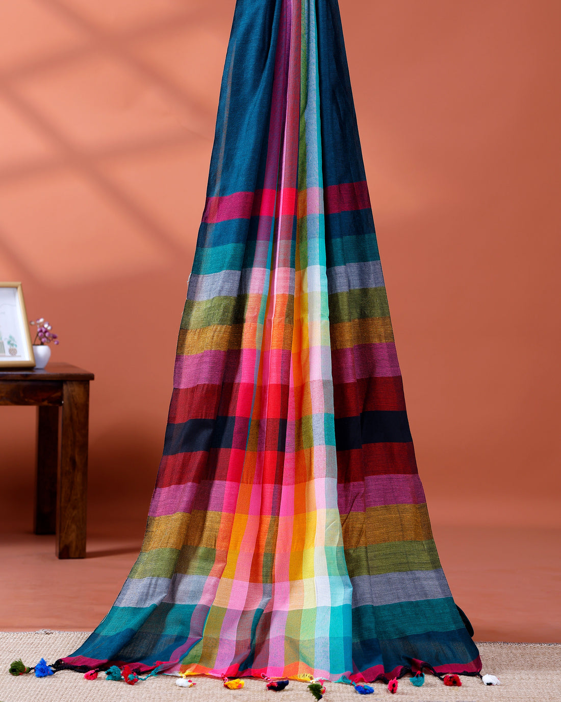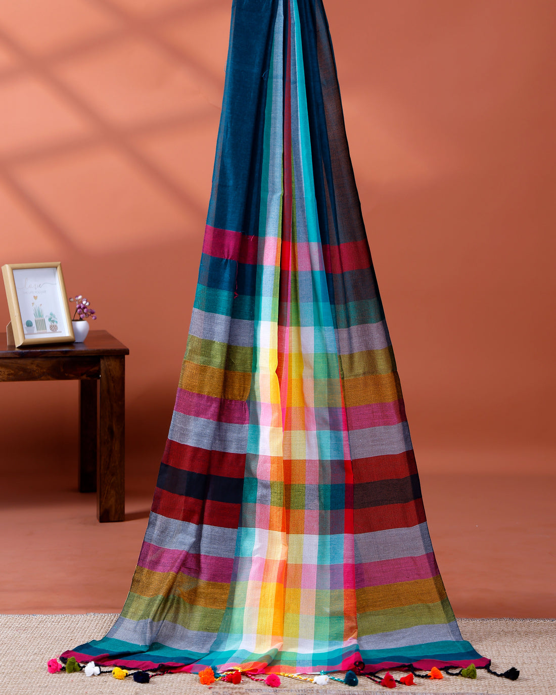 Elegant Rainbow Cotton Saree with Striped Pattern and Tassel Border - Dark Blue