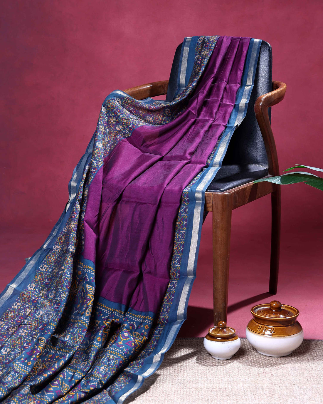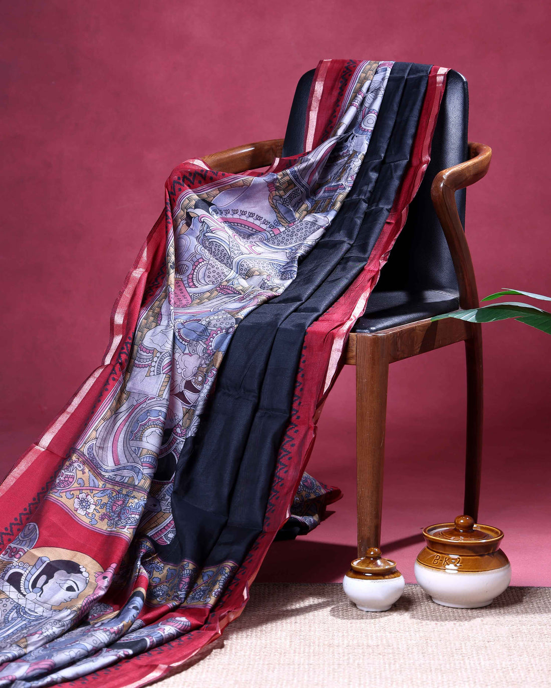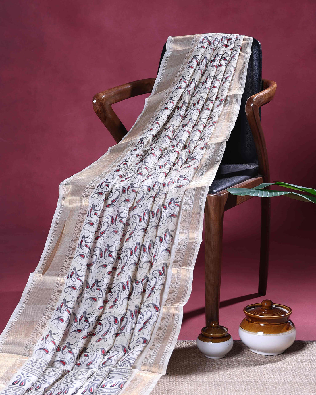 Elegant Semi Chanderi Saree with a Half Plain and Half Madubani Inspired Body and a Plain Border - Burgundy
