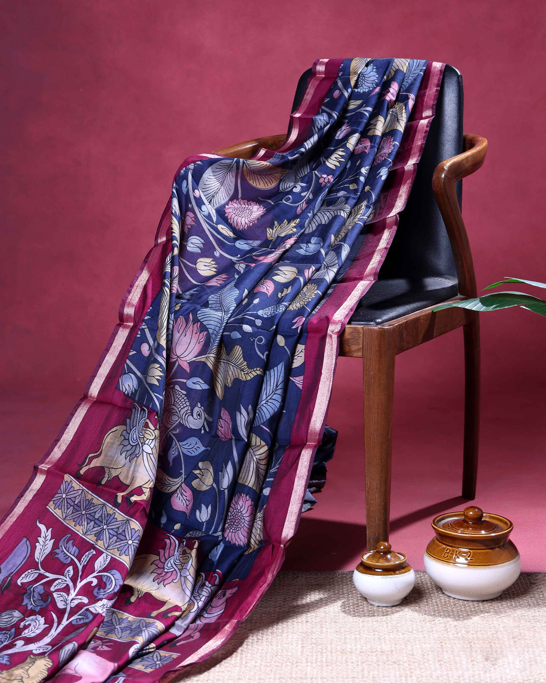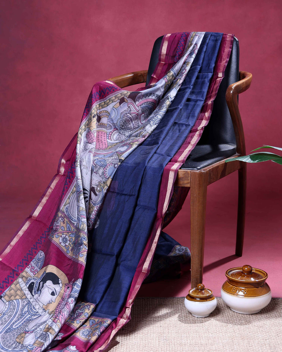 Elegant Semi Chanderi Saree with a Half Plain and Half Madubani Inspired Body and a Plain Border - Navy