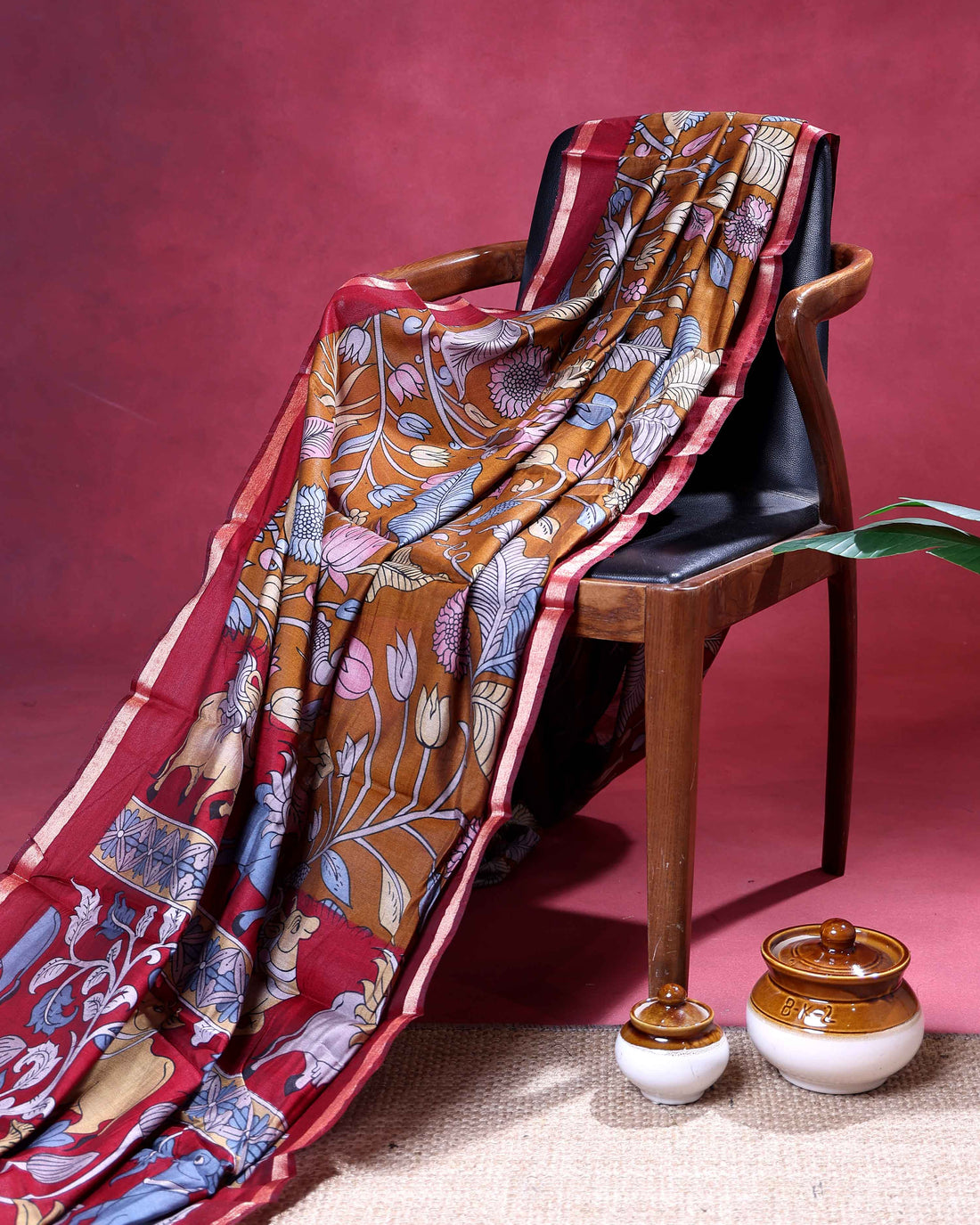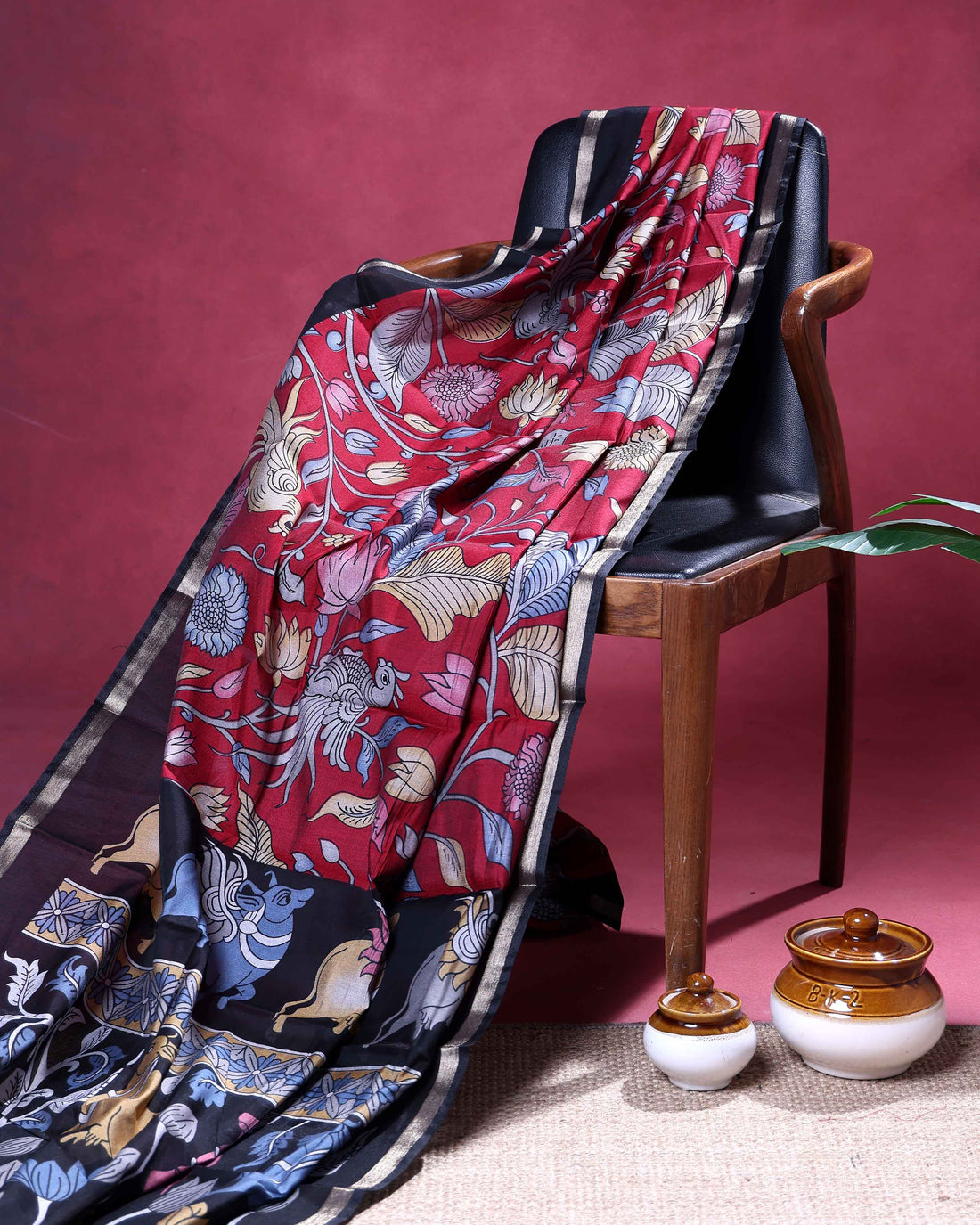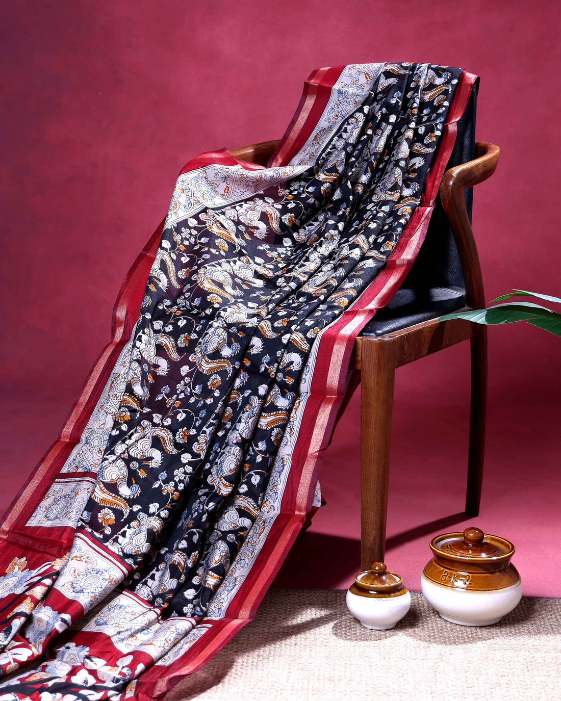 Elegant Semi Chanderi Saree with Kalamkari Inspired Motifs and A Plain Gold Woven Border - Black