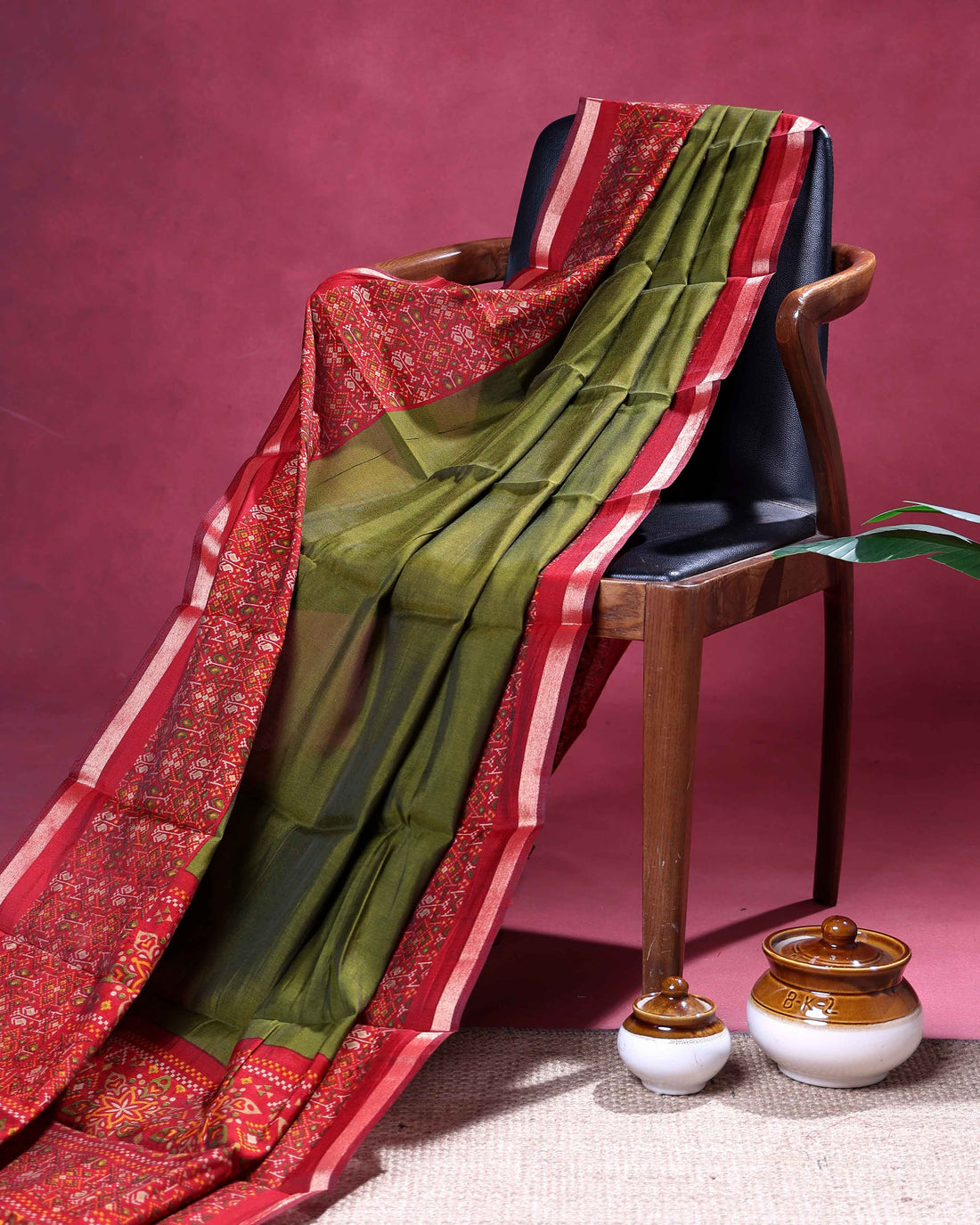 Elegant Semi Chanderi Saree with a Madubani Inspired Body and a Plain Border - Olive