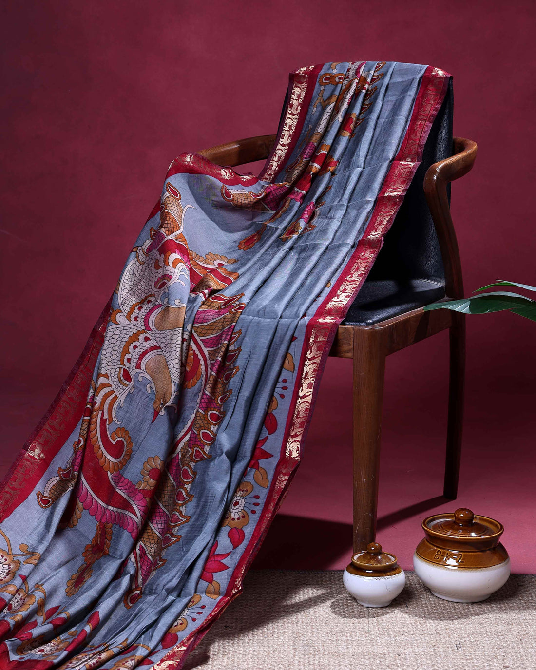 Elegant Semi Chanderi Saree with a Half Plain and Half Kalamkari Inspired Body and a Zari Border - Grey