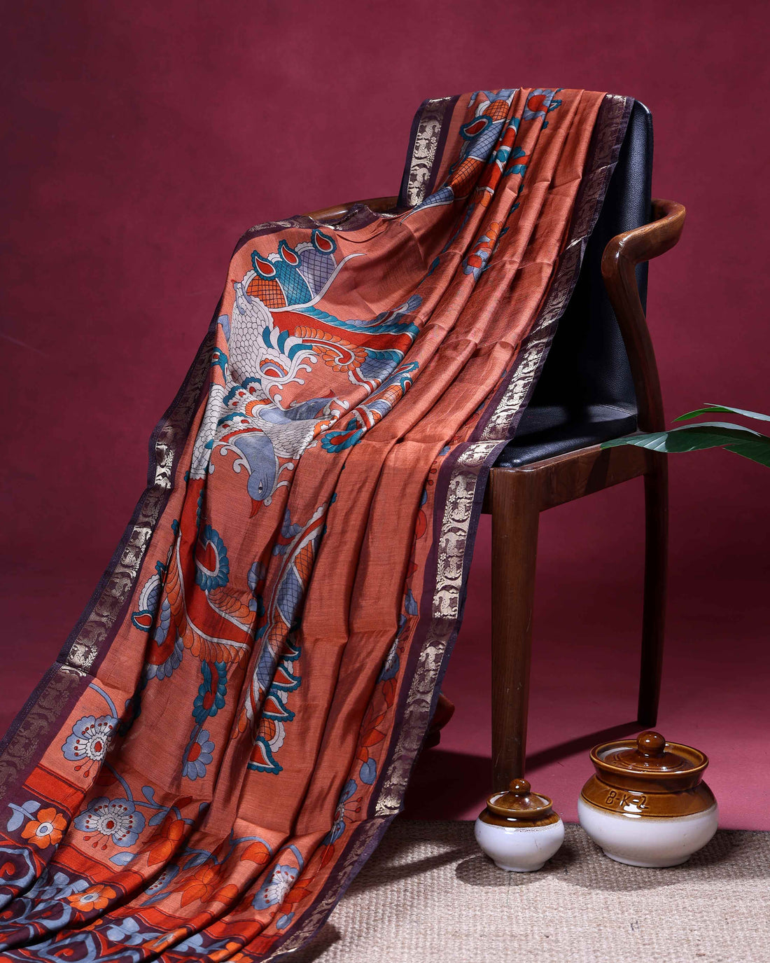 Elegant Semi Chanderi Saree with a Half Plain and Half Kalamkari Inspired Body and a Zari Border - Orange