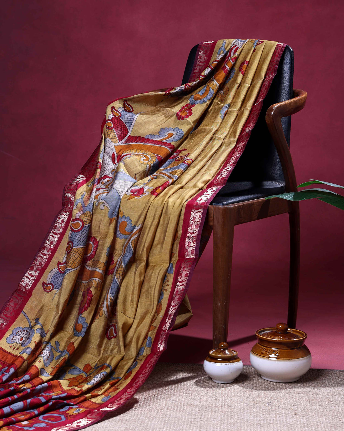 Elegant Semi Chanderi Saree with a Half Plain and Half Kalamkari Inspired Body and a Zari Border - Yellow