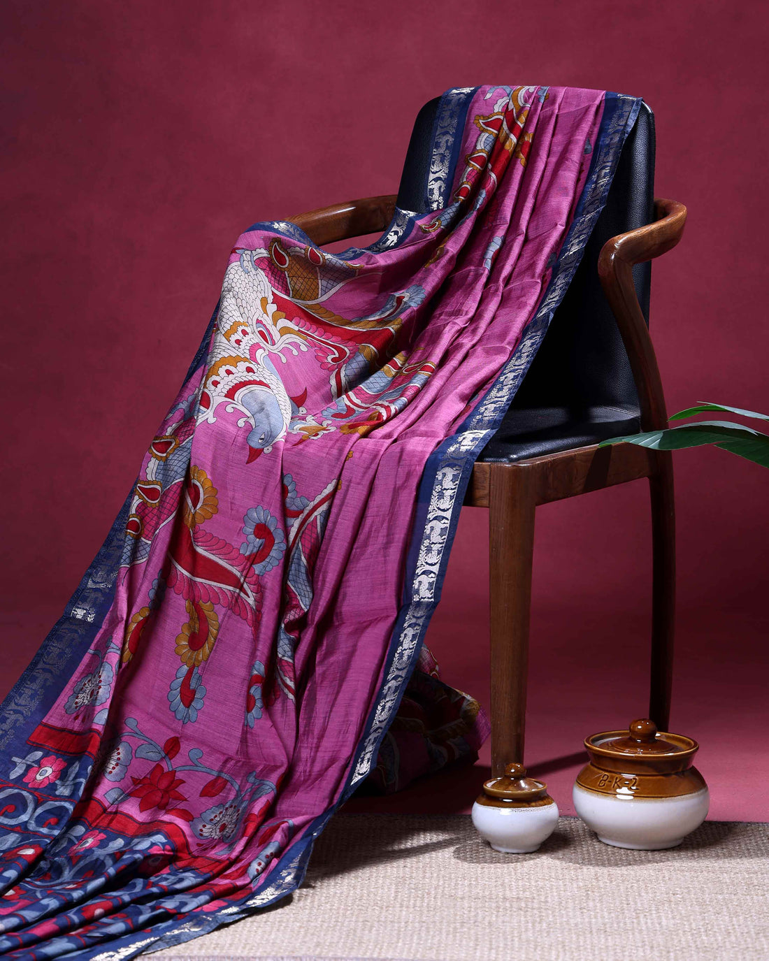 Elegant Semi Chanderi Saree with a Half Plain and Half Kalamkari Inspired Body and a Zari Border - Pink