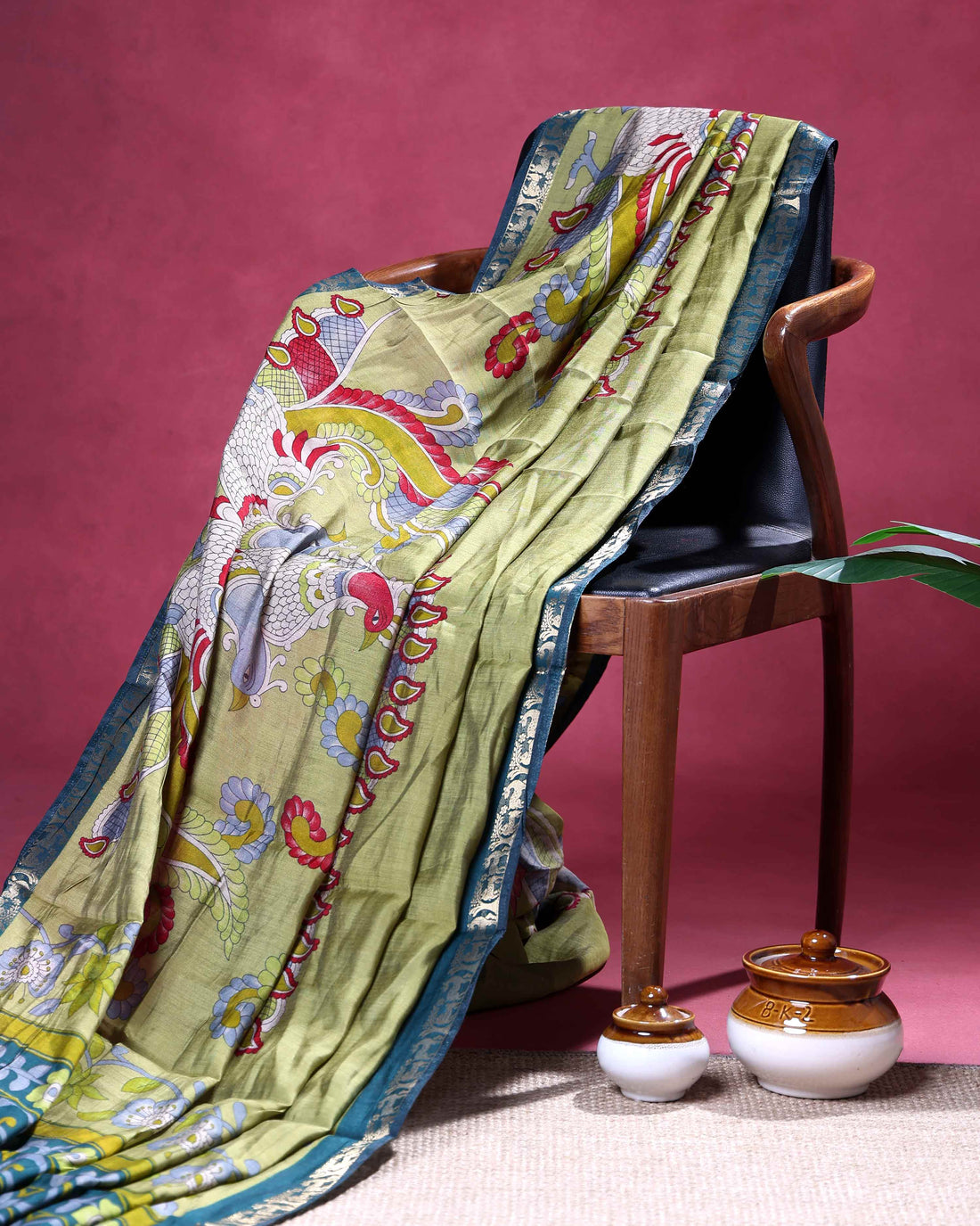 Elegant Semi Chanderi Saree with a Half Plain and Half Kalamkari Inspired Body and a Zari Border - Light Green