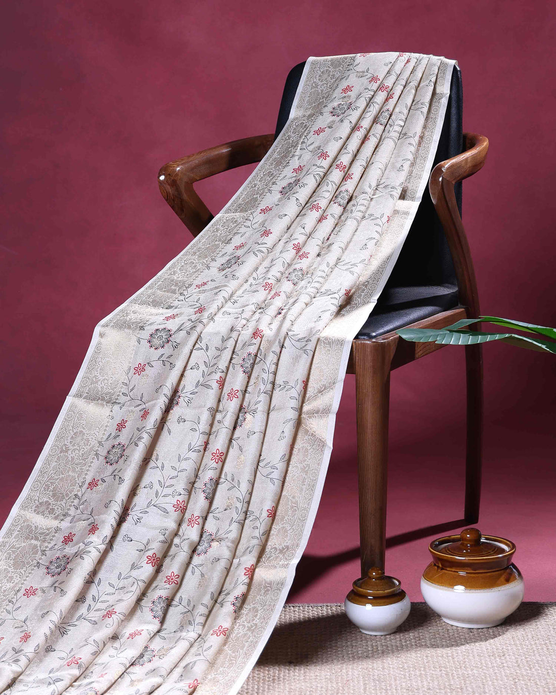 Elegant Semi Chanderi Saree with a Plain Body and Floral Inspired Border Border - Red