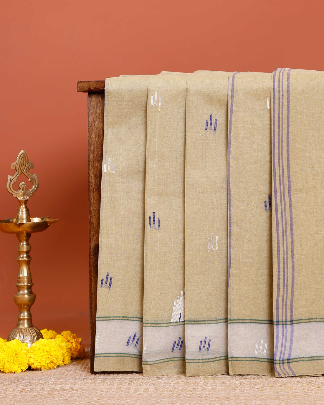 Handloom Bengal Cotton Saree with Traditional Jamdani Motifs and Border Detailing - Light Brown