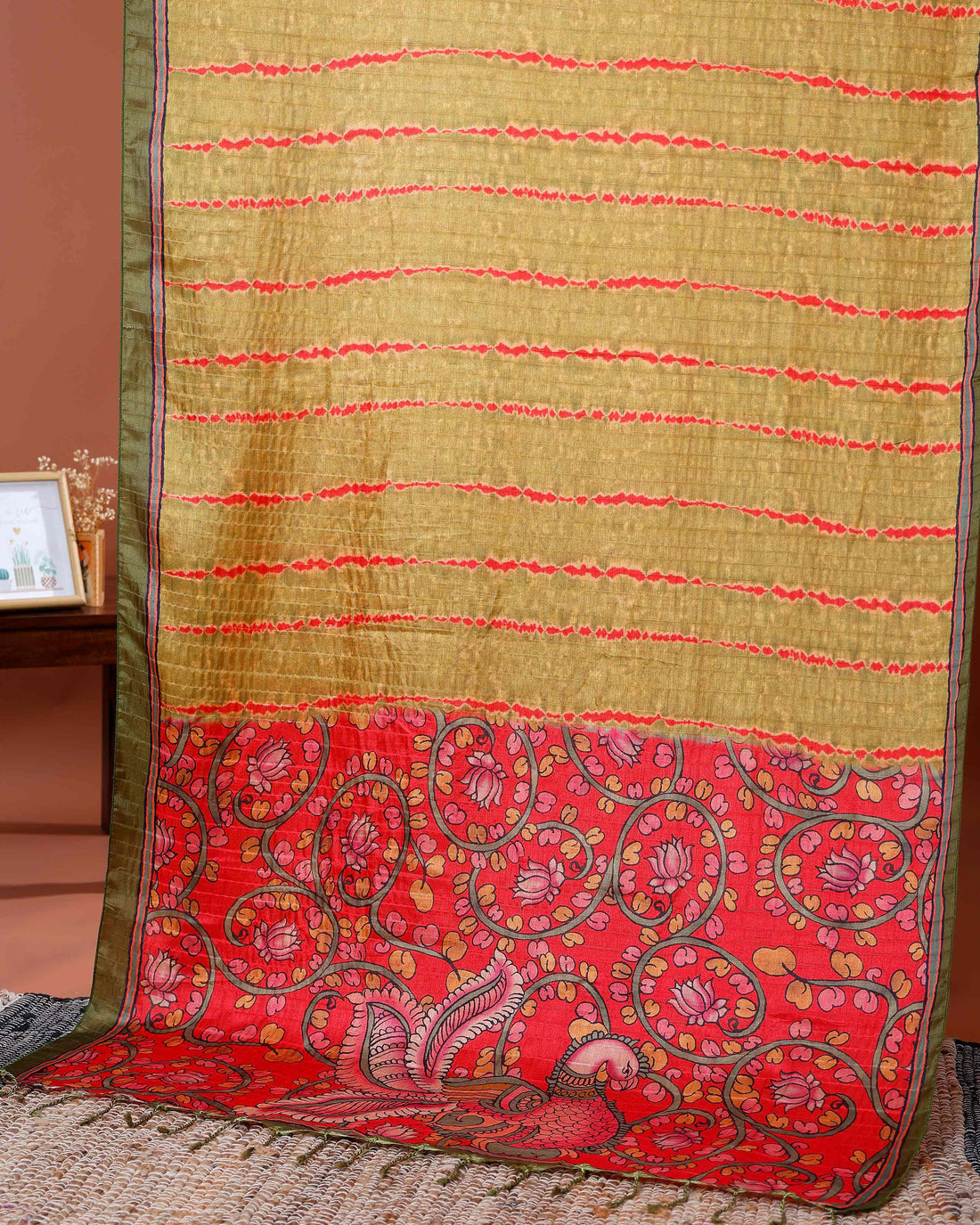 Elegant Semi Tussar Silk Saree with Intricate Floral Patterns and Textured Stripes - Olive Green