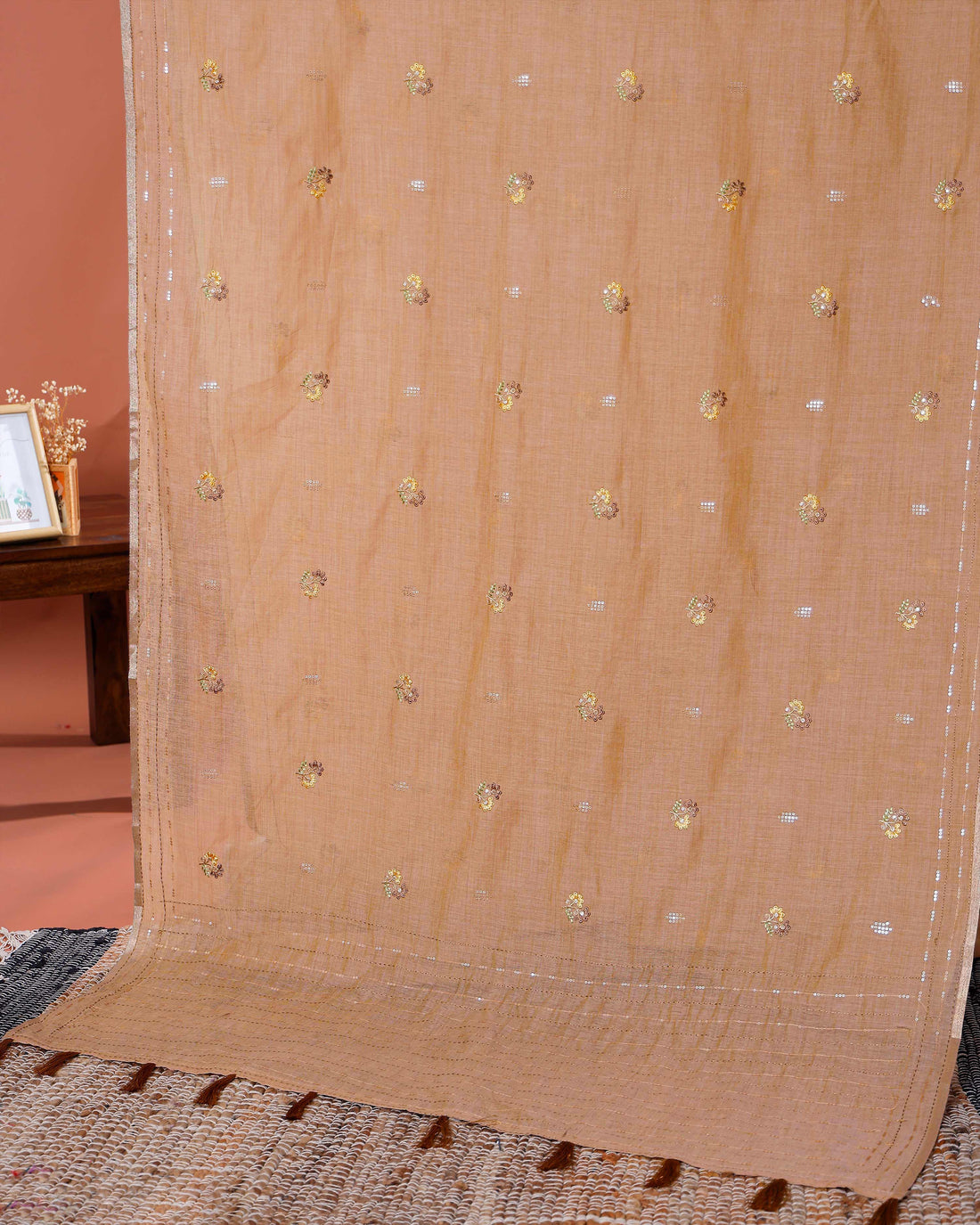 Elegant Linen Cotton Saree with Floral Embroidered and Tasselled Pallu - Peach
