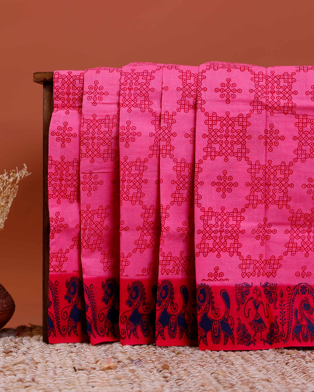 Traditional Chettinad Cotton Saree with Contrast Temple Border and Intricate Zari Detailing - Pink