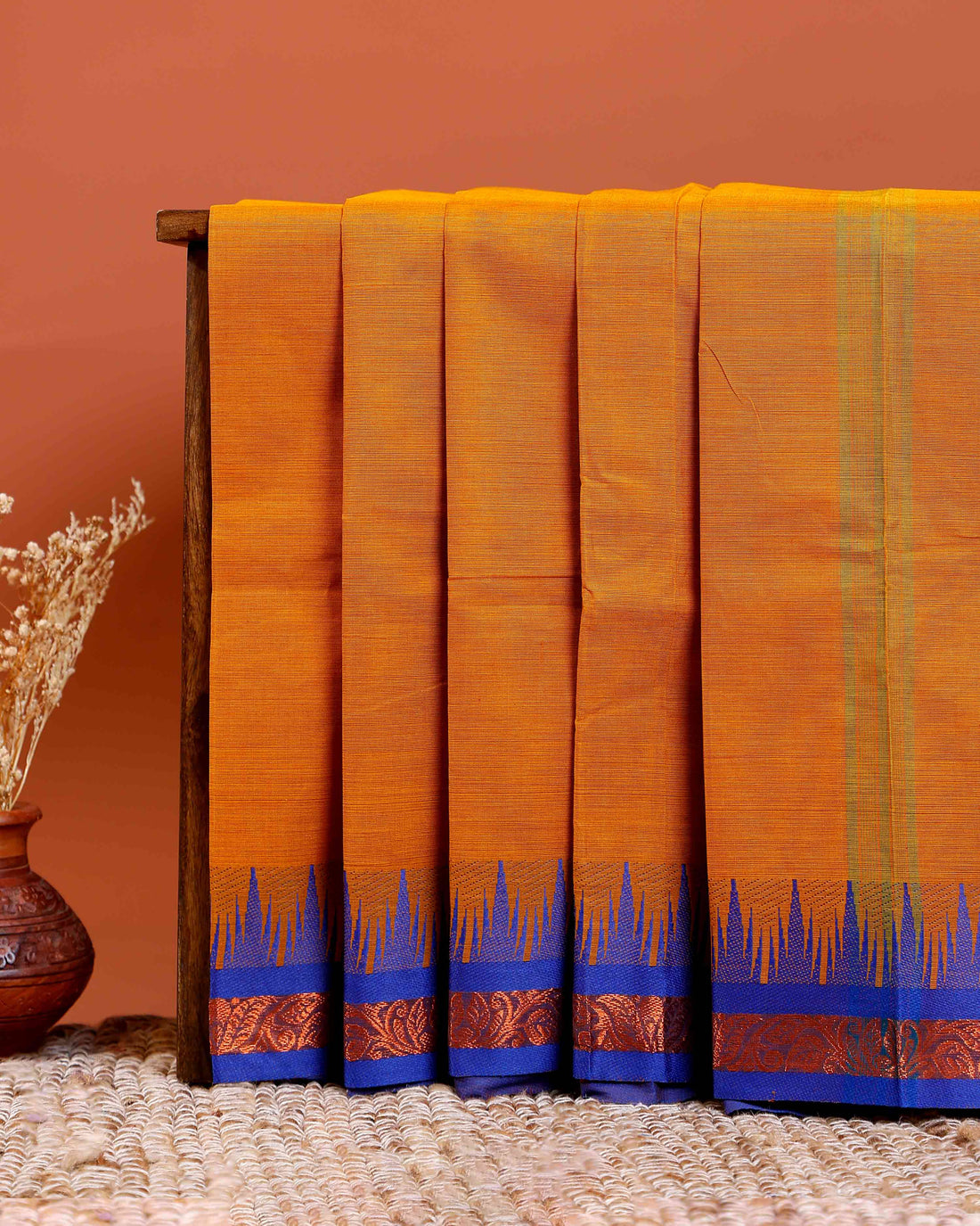 Traditional Chettinad Cotton Saree with Contrast Temple Border and Intricate Zari Detailing - Mustard