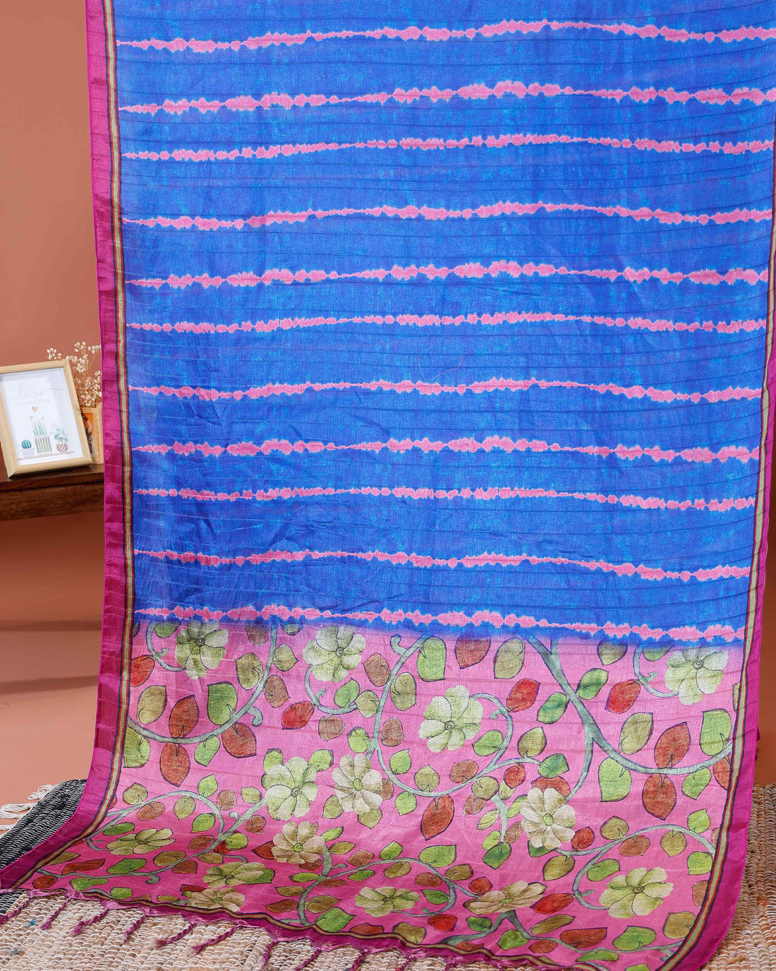 Elegant Semi Tussar Silk Saree with Intricate Nature-Inspired Patterns and Textured Stripes - Blue