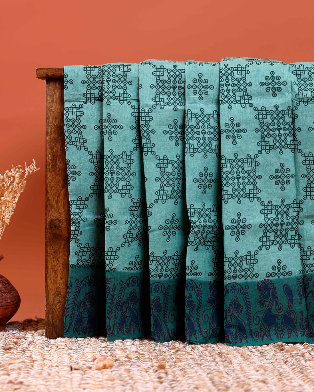 Handloom Chettinad Cotton Saree with Small Butta Weaves, Zari Peacock Motif Border and Contrast Pallu - Green