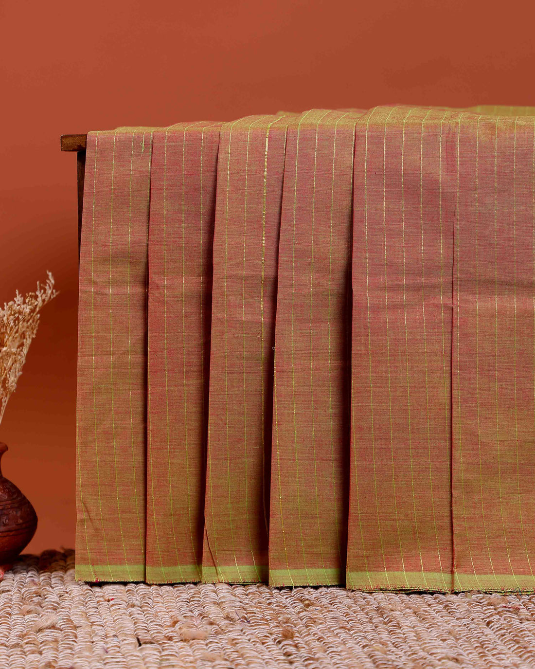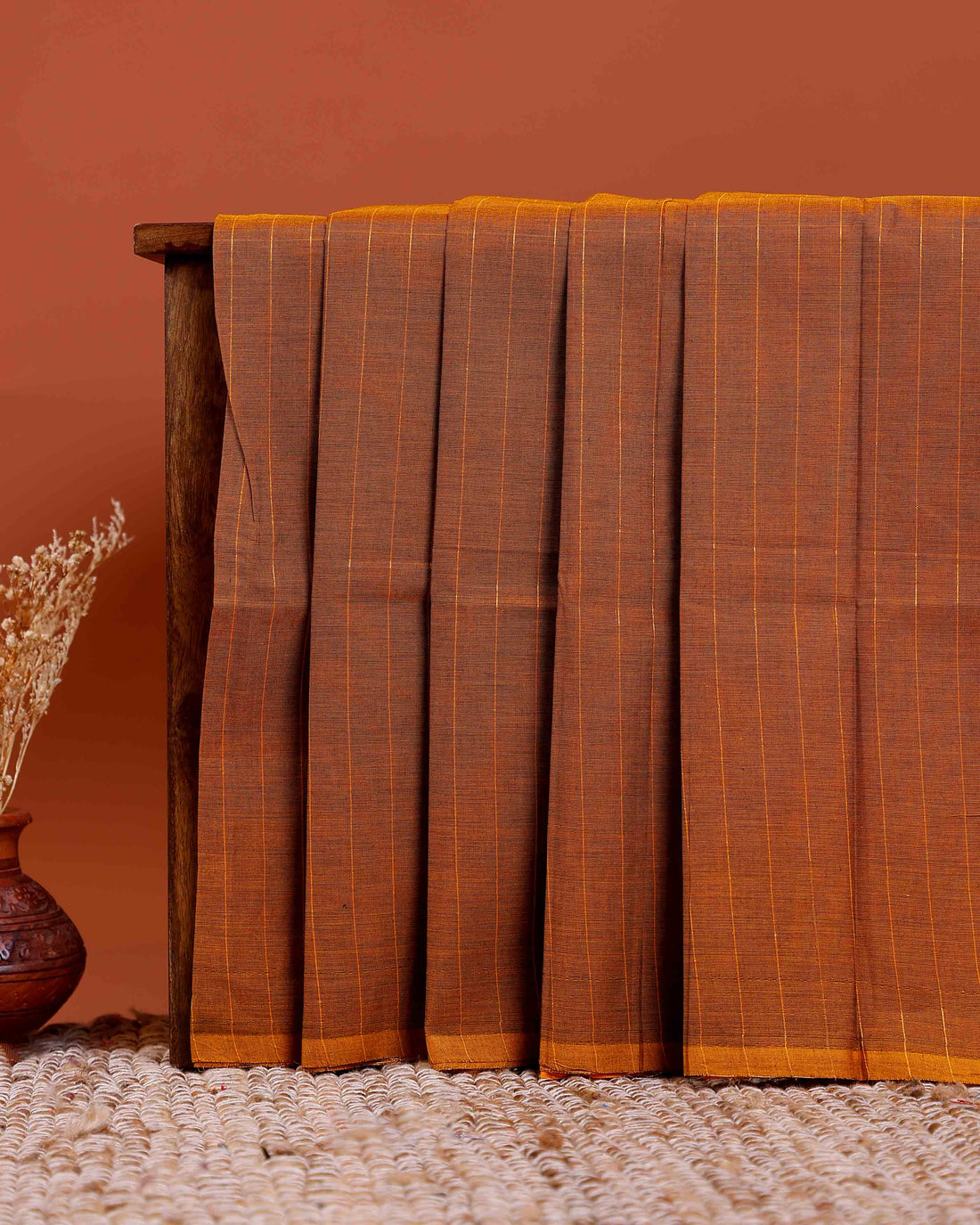 Traditional Chettinad Cotton Saree with Subtle Stripes and Traditional Weave - Reddish-Brown