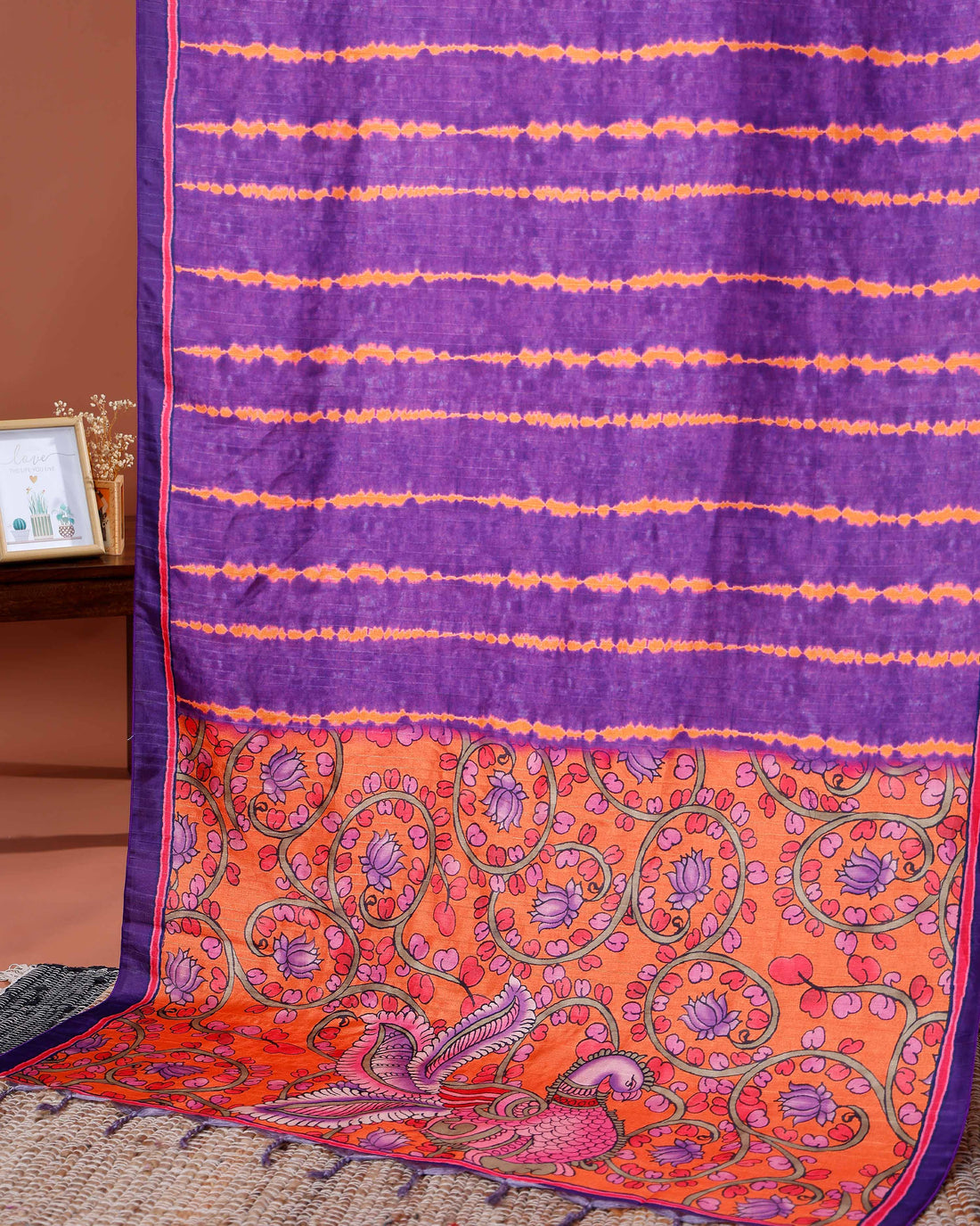 Elegant Semi Tussar Silk Saree with Intricate Nature-Inspired Patterns and Textured Stripes - Purple