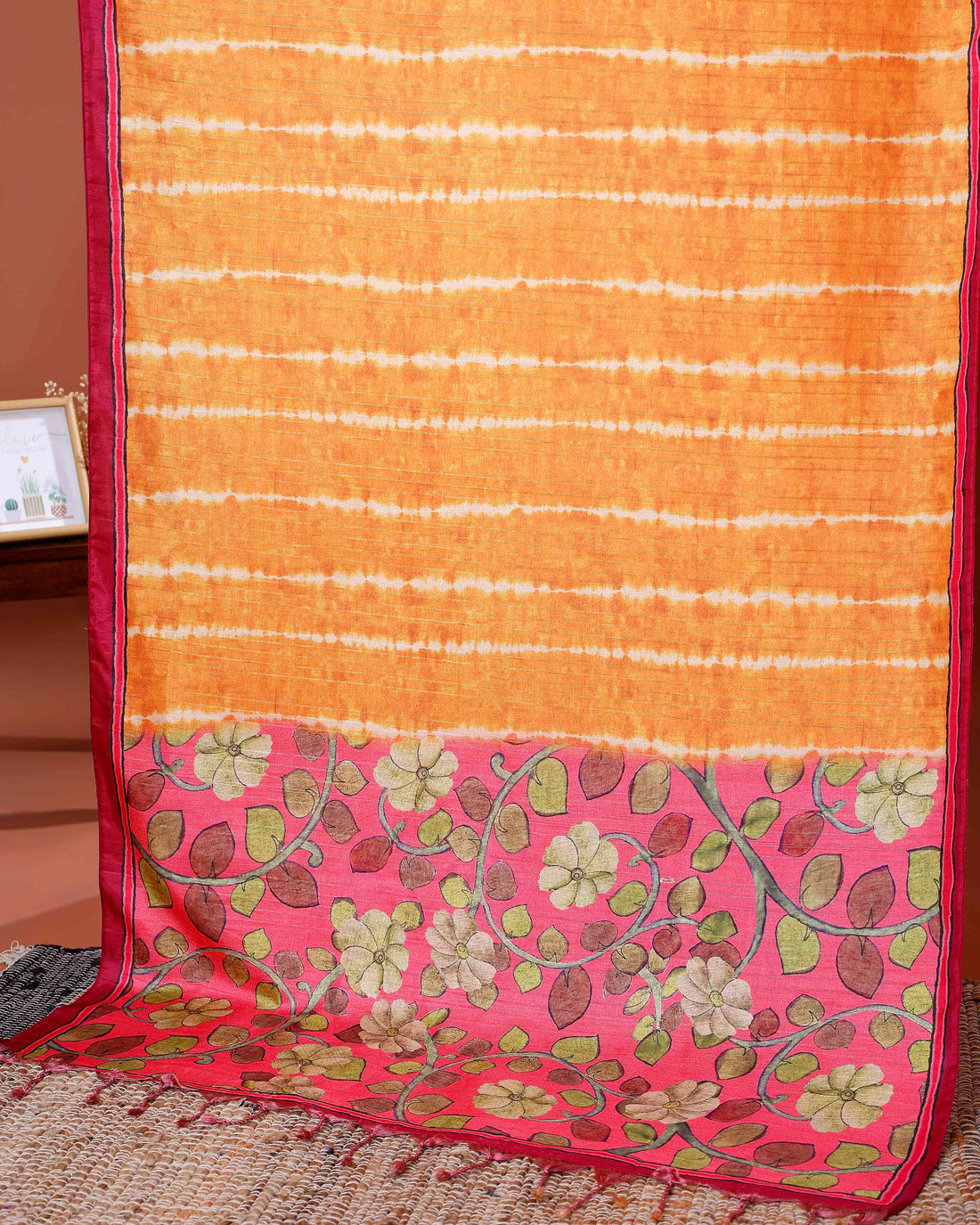 Elegant Semi Tussar Silk Saree with Intricate Floral Patterns and Textured Stripes - Orange