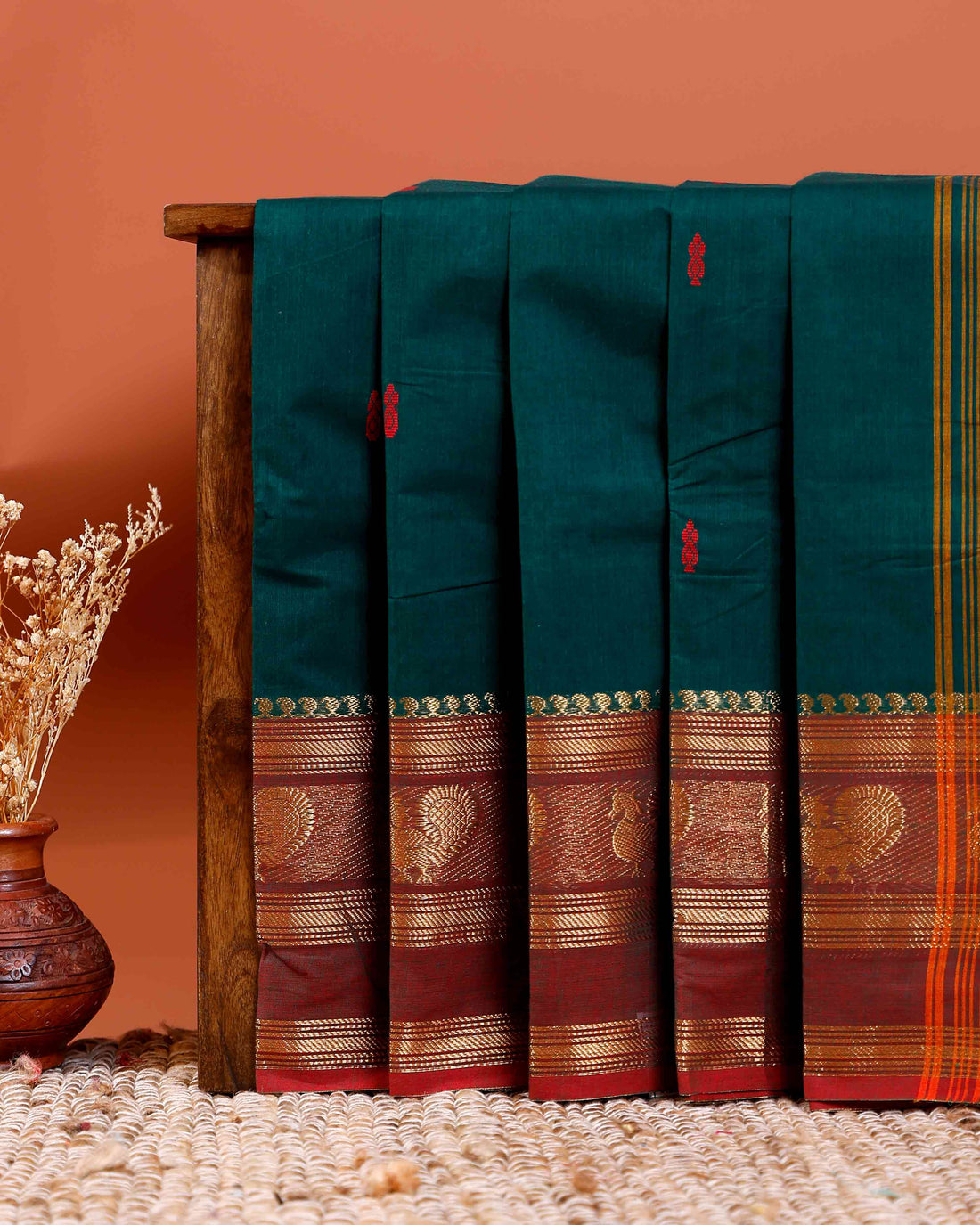 Handloom Chettinad Cotton Saree with Butta Weaves, Zari Peacock Motif Border and Contrast Pallu - Dark Green