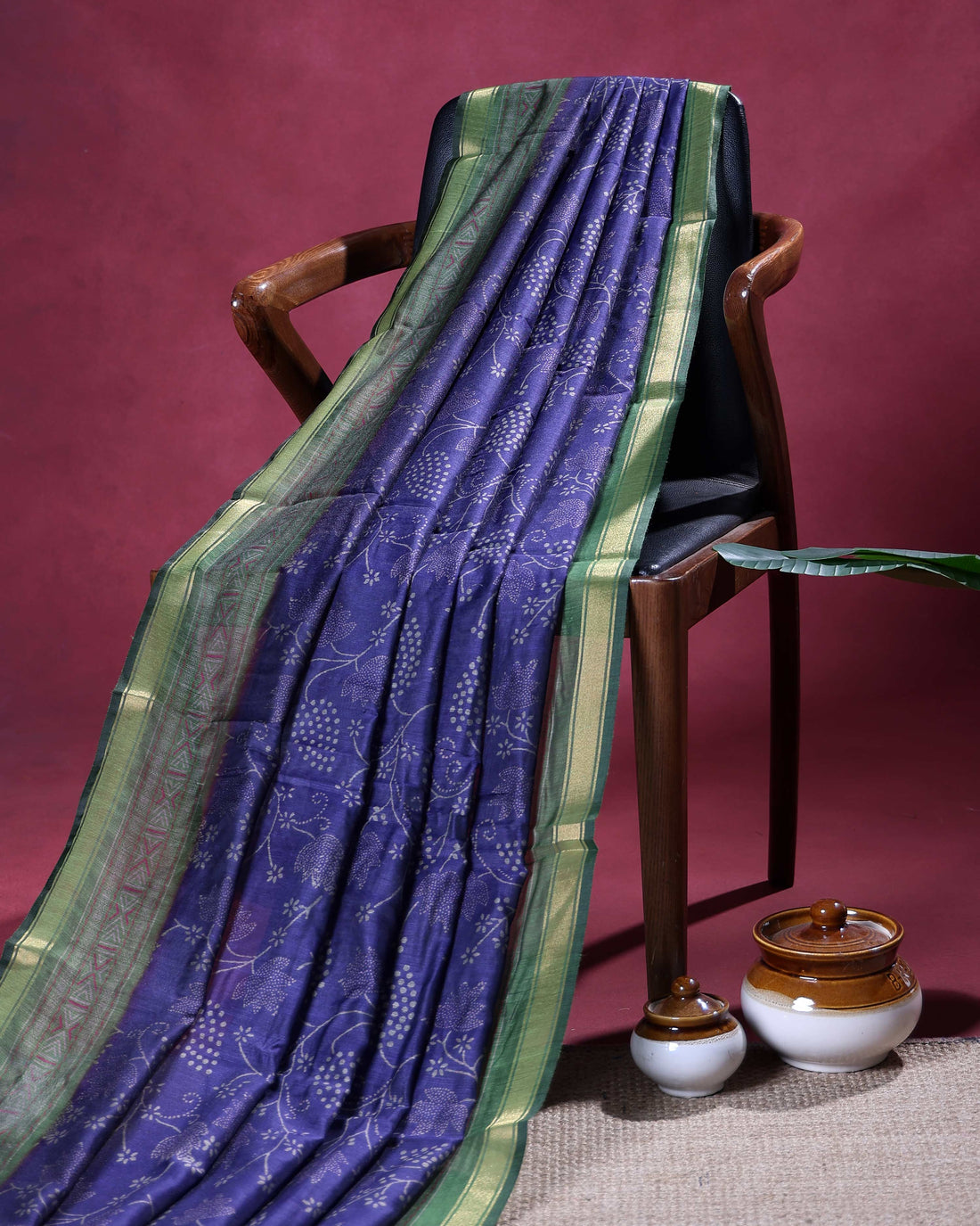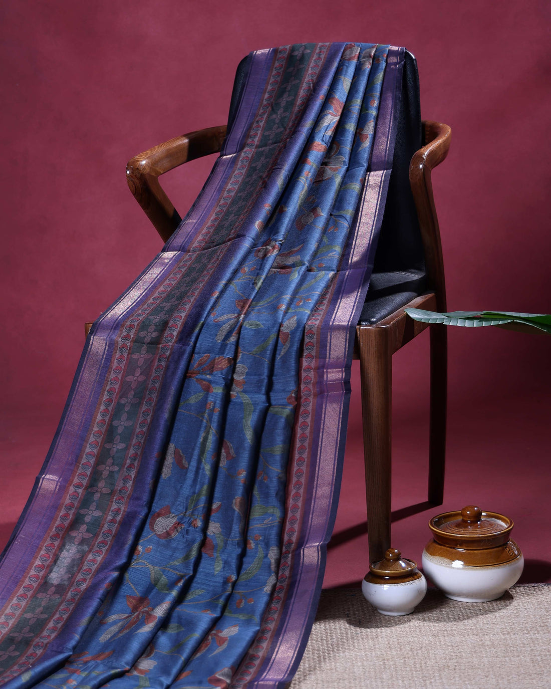 Elegant Semi Chanderi Saree with All-Over Floral Vine Buta Motifs and Intricately Contrast Zari Border - Royal Blue