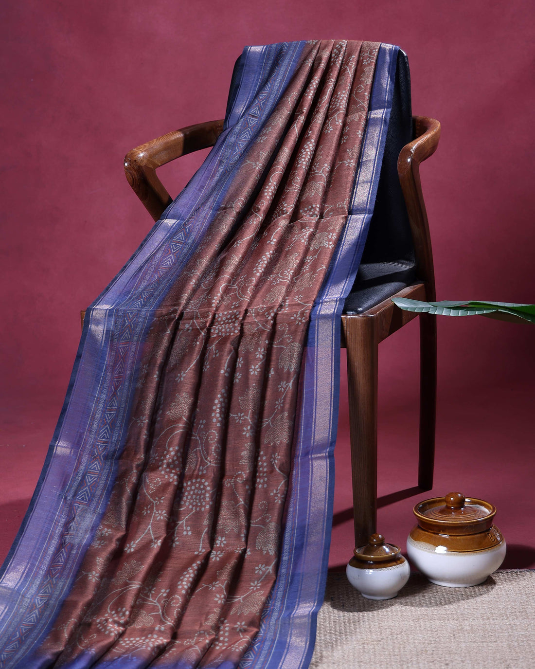 Elegant Semi Chanderi Saree with All-Over Floral Vine Buta Motifs and Intricately Contrast Zari Border - Coffee Brown