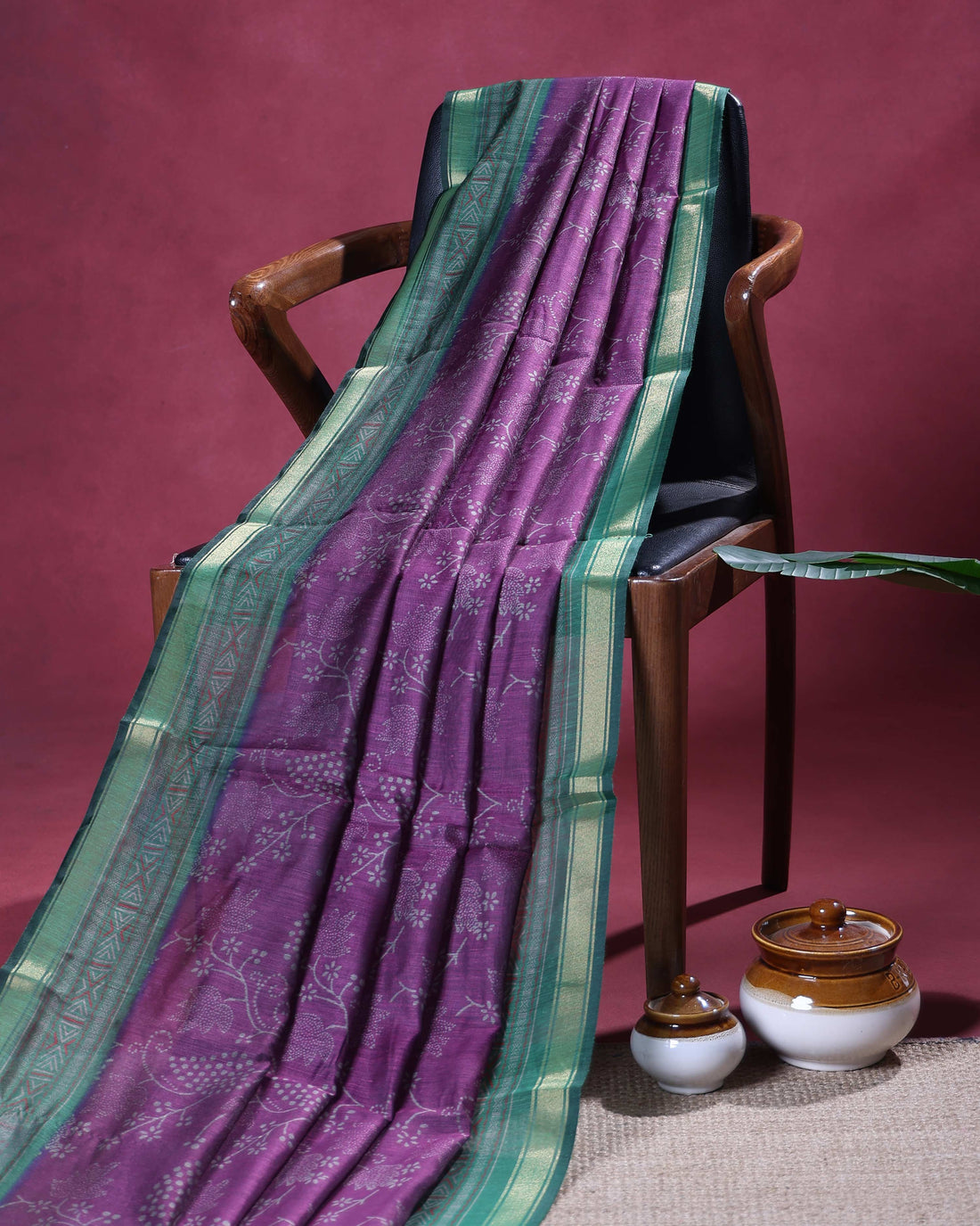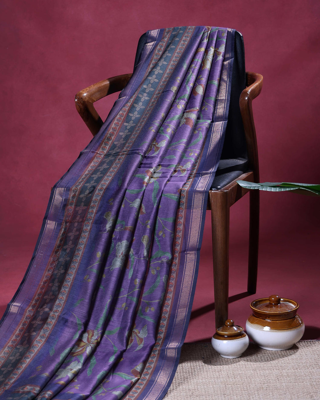 Elegant Semi Chanderi Saree with All-Over Floral Vine Buta Motifs and Intricately Contrast Zari Border - Purple