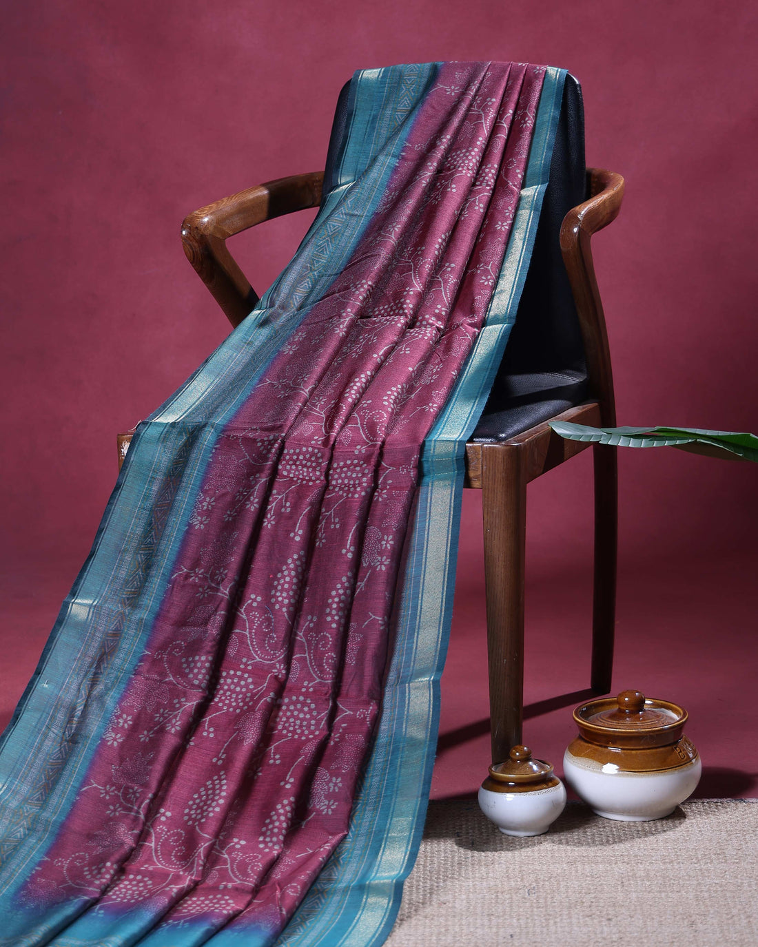 Elegant Semi Chanderi Saree with All-Over Floral Vine Buta Motifs and Intricately Contrast Zari Border - Maroon