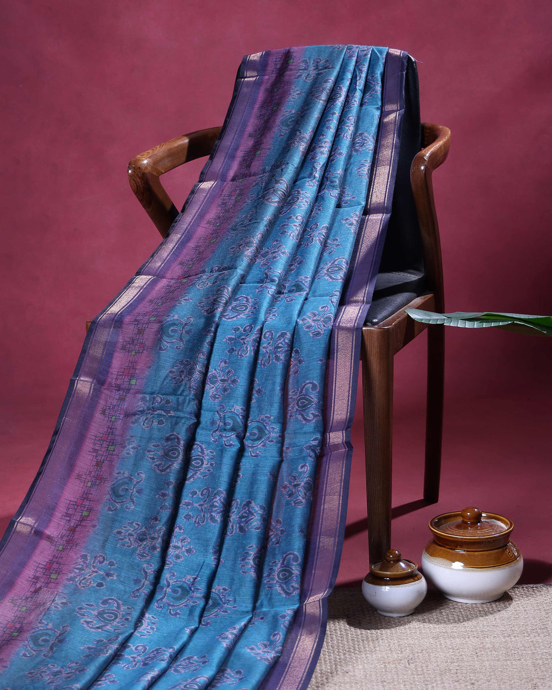 Elegant Linen Cotton Saree with Woven Floral Butta Motifs and Intricate Jacquard Border Design - Teal Blue