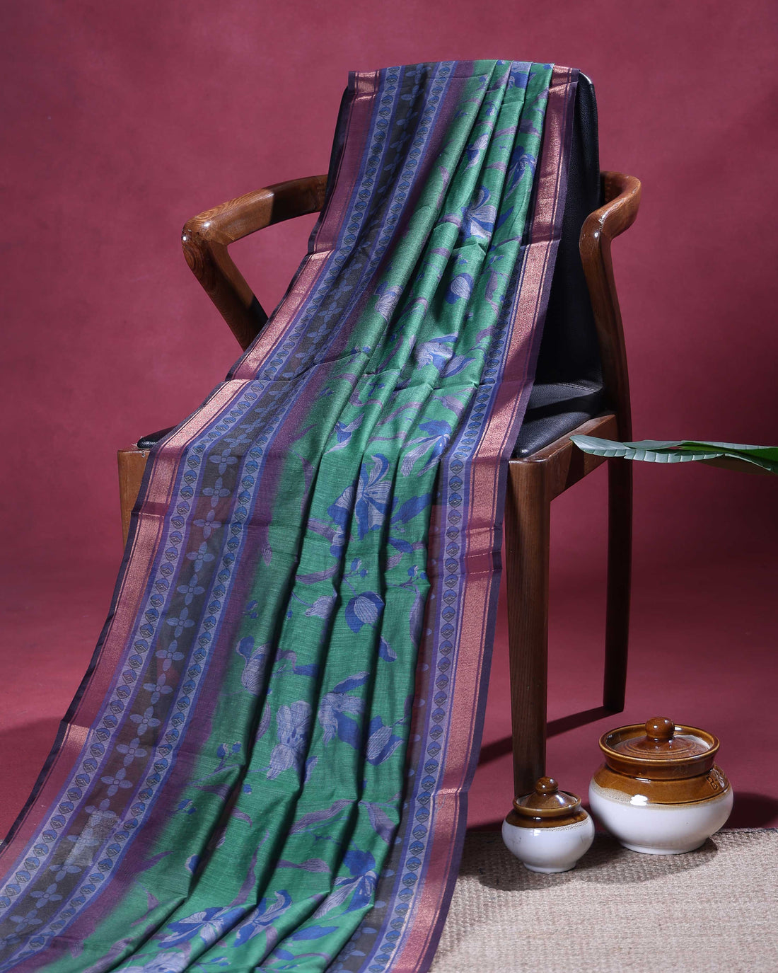 Elegant Linen Cotton Saree with Woven Floral Butta Motifs and Intricate Jacquard Border Design - Green