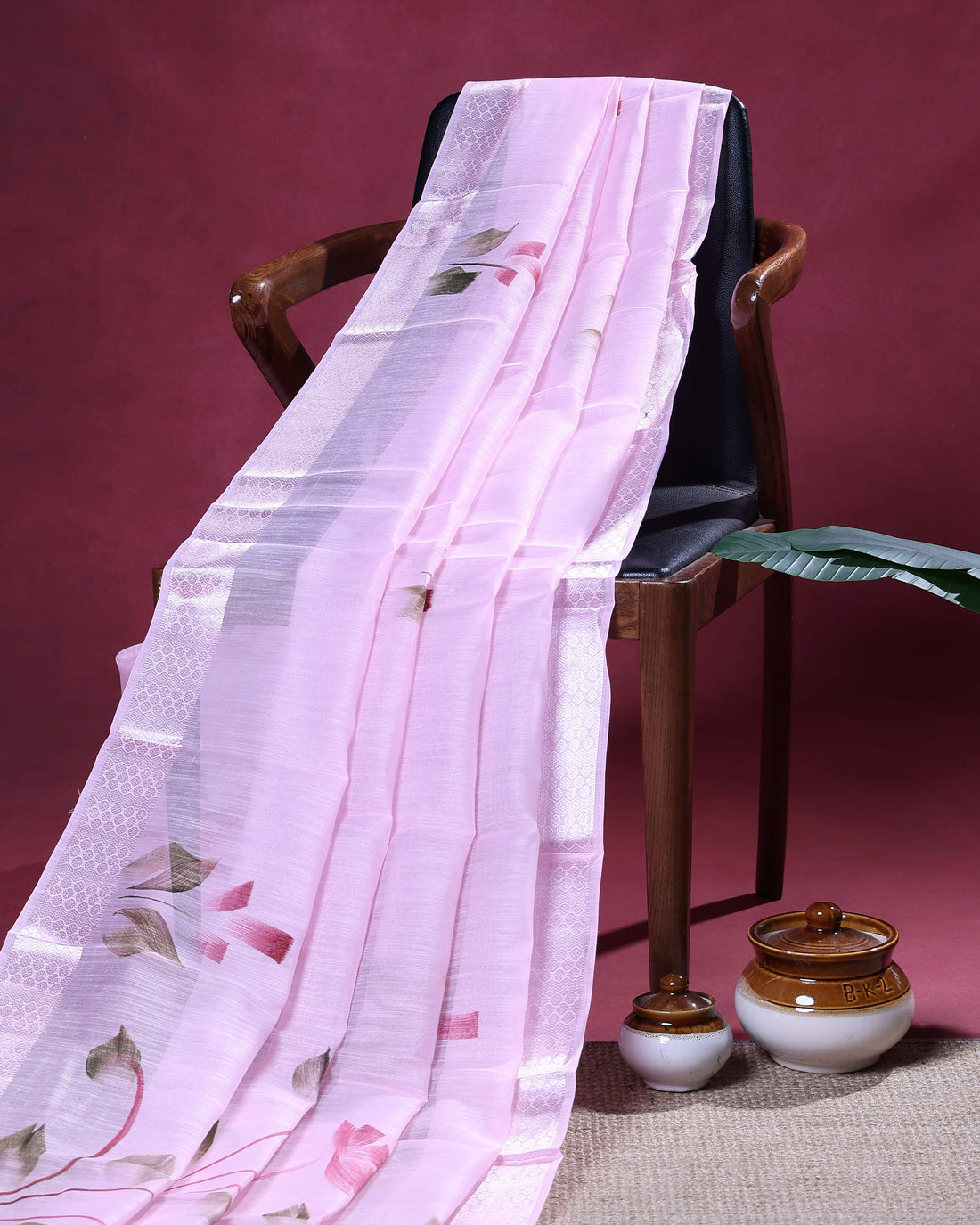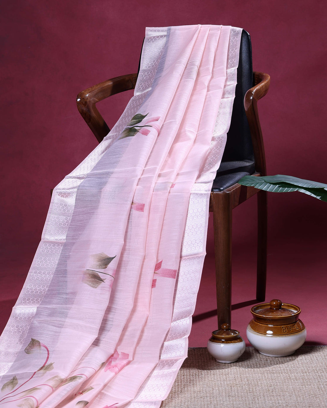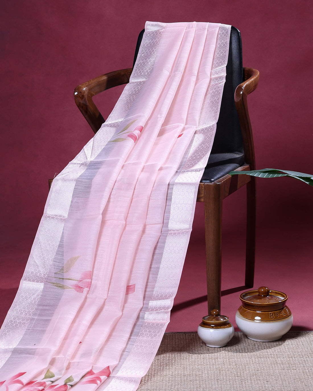 Elegant Linen Tissue Saree with Delicate Floral Motifs and Intricate Woven Border - Pastel Pink