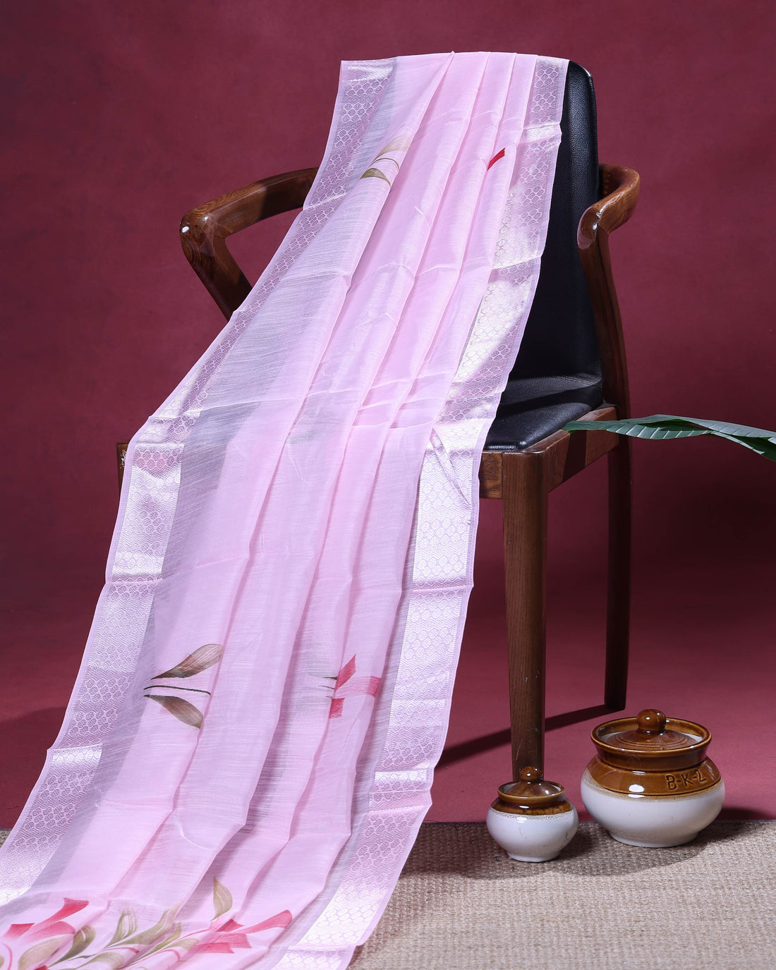 Traditional Linen Tissue Saree with Delicate Floral Motifs and Intricate Woven Border - Pastel Pink