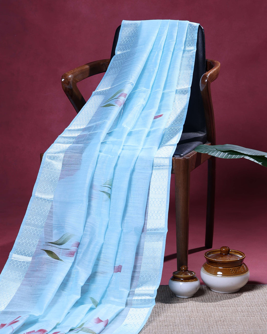 Traditional Linen Tissue Saree with Delicate Floral Motifs and Intricate Woven Border - Sky Blue
