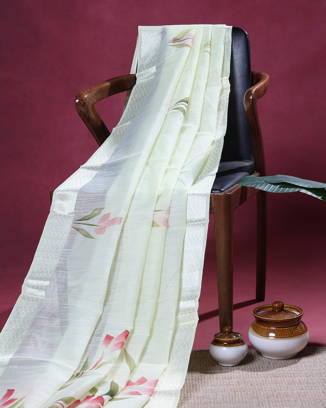 Traditional Linen Tissue Saree with Delicate Floral Motifs and Intricate Woven Border - Pista Green