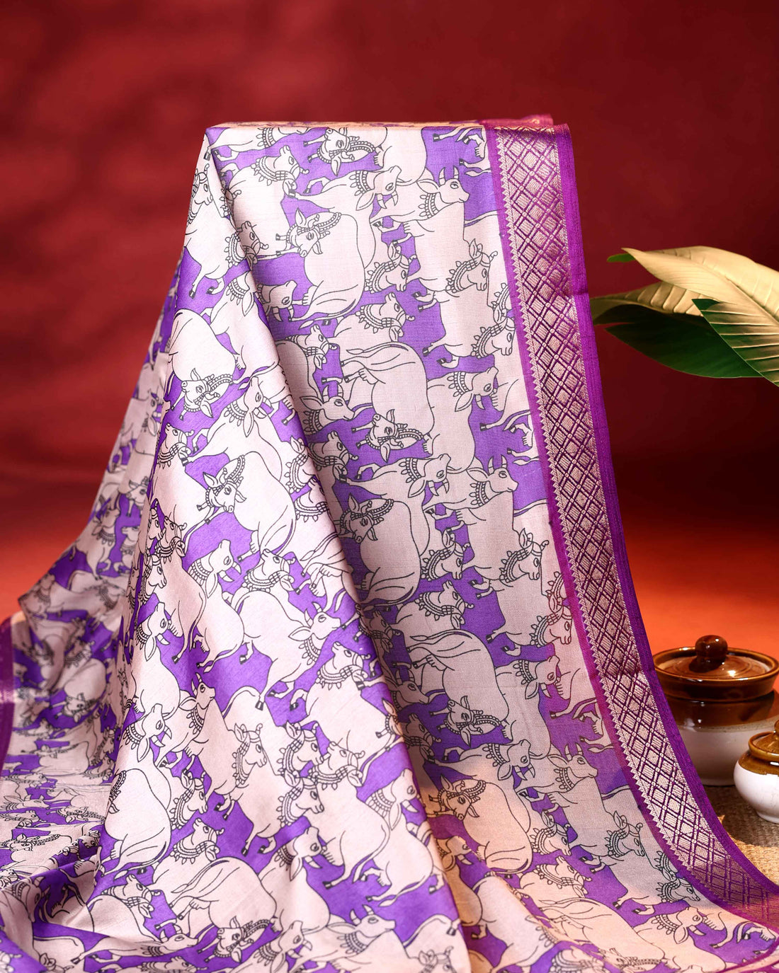 Elegant Semi Chanderi Saree with Traditional Animal Motif Print and Contrasting Zari Woven Border - Purple
