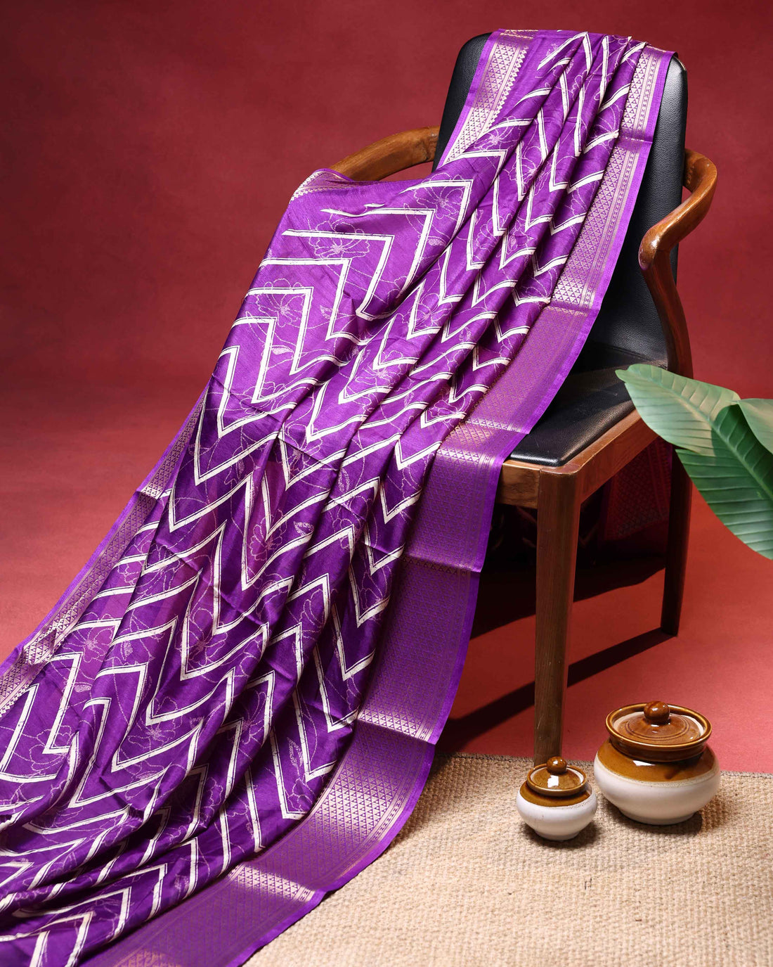 Elegant Dola Saree with Chevron and Floral Inspired Print and Classic Zari Woven Border - Purple