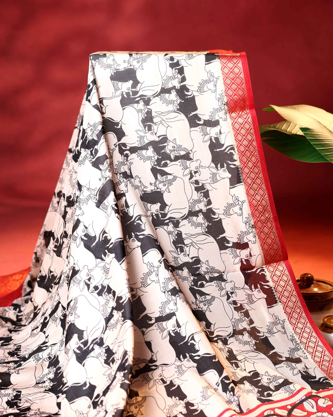 Elegant Semi Chanderi Saree with Traditional Animal Motif Print and Contrasting Zari Woven Border - Black