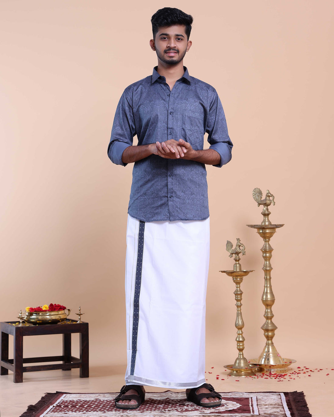 Elegant Men's Ethnic Half Sleeve Shirt & Dhoti Set with Zari Border - Blue
