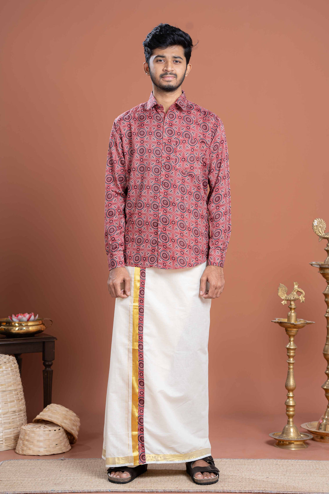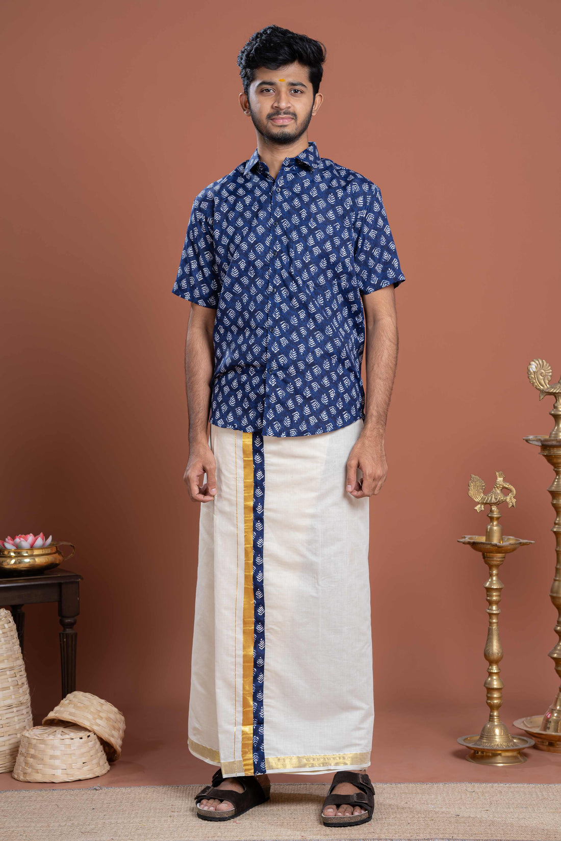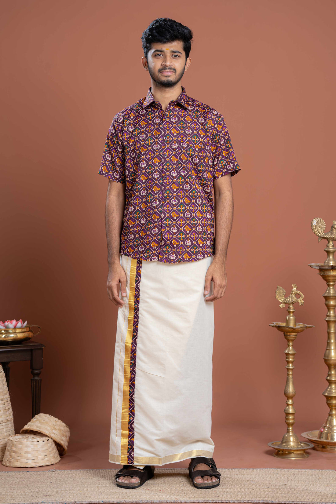 Men's Traditional Ethnic Printed Half-Sleeve Shirt with Kasavu Border Dhoti Set - Multi